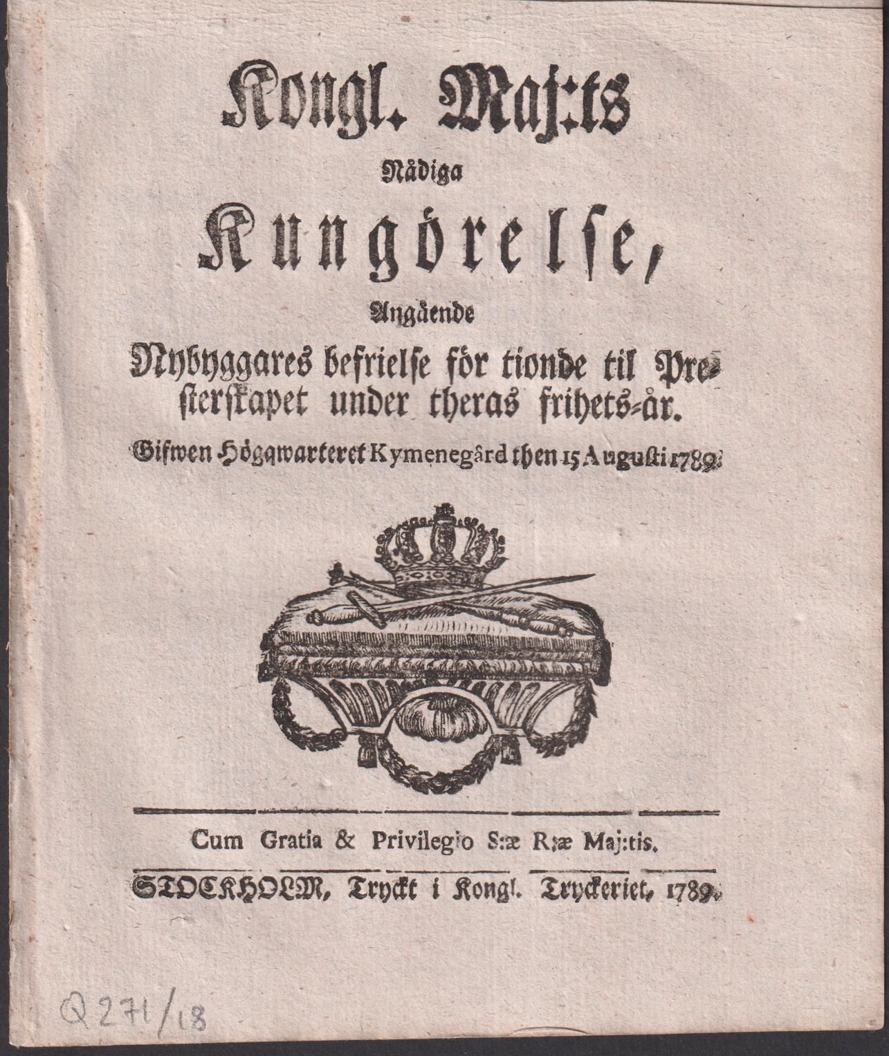 Kongl. Maj:ts Nådiga Kungörelse, Angående Nybyggares befrielse för tionde til Presterskapet under theras frihets-år. Gifwen Högqwarteret Kymenegård then 15 Augusti 1789.
