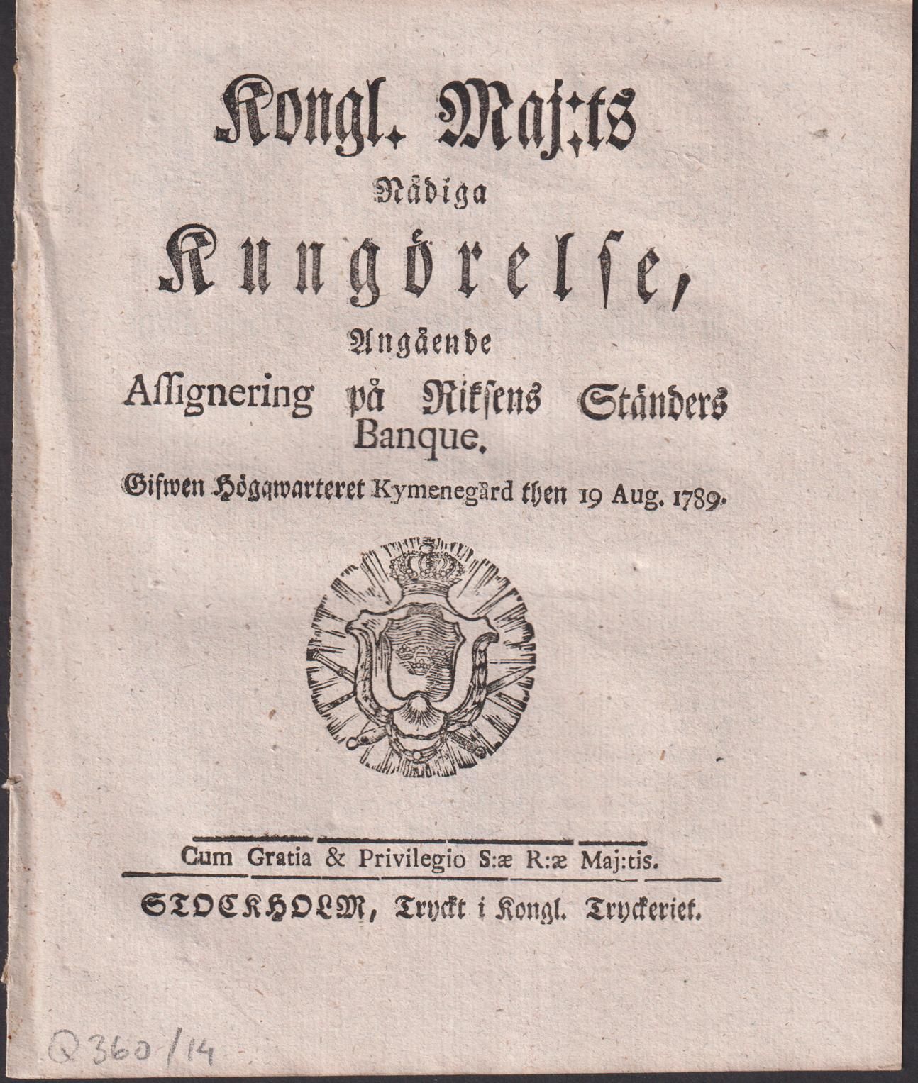 Kongl. Maj:ts Nådiga Kungörelse, Angående Assignering på Riksens Ständers Banque. Gifwen Högqwarteret Kymenegård then 19 Aug. 1789.