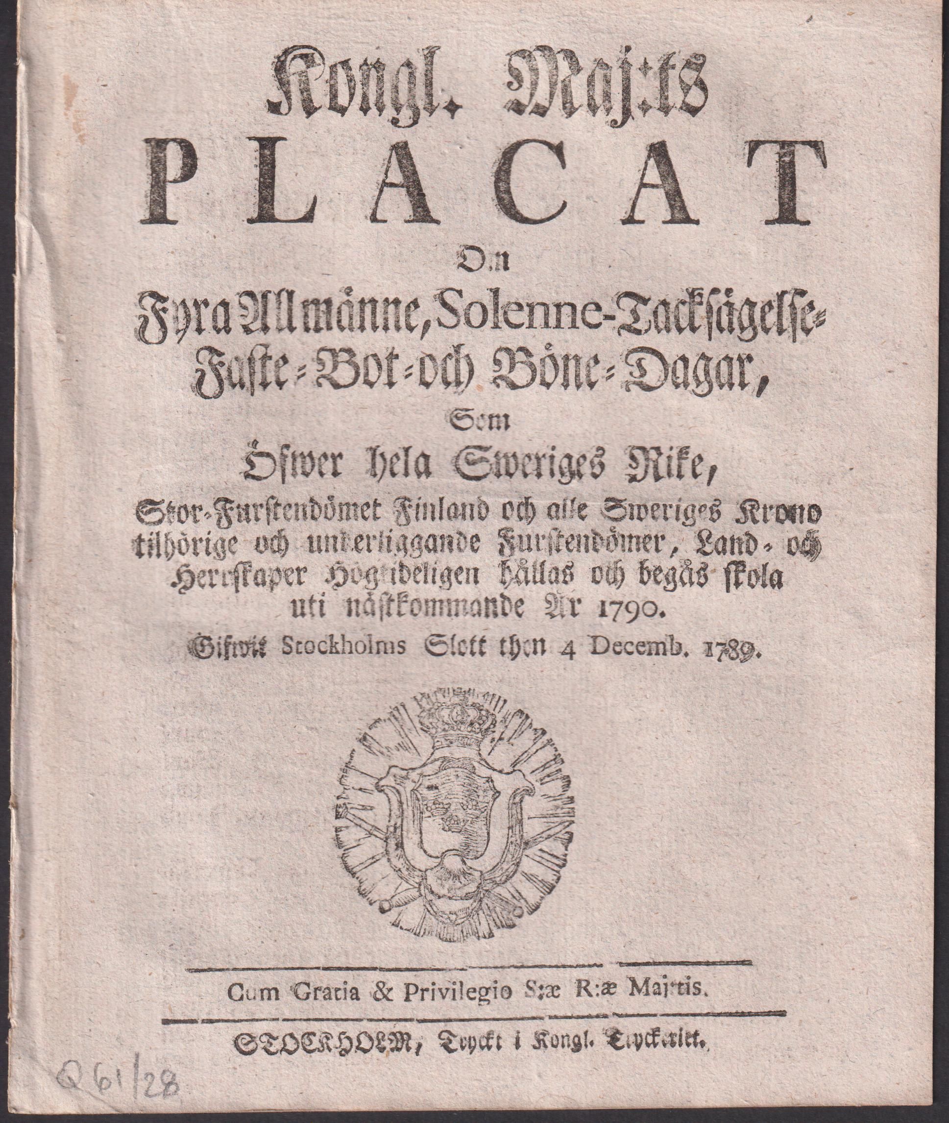 Kongl. Maj:ts Placat Om Fyra Allmänne, Solenne- Tacksägelse- Faste- Bot- och Böne-Dagar, Som Öfwer hela Sweriges Rike, Stor-Furstendömet Finland och alle Sweriges Krono tilhörige och underliggande Furstendömer, Land- och Herrskaper Högtideligen hållas och begås skola uti nästkommande År 1790. Gifwit Stockholms Slott then 4 Decemb. 1789.