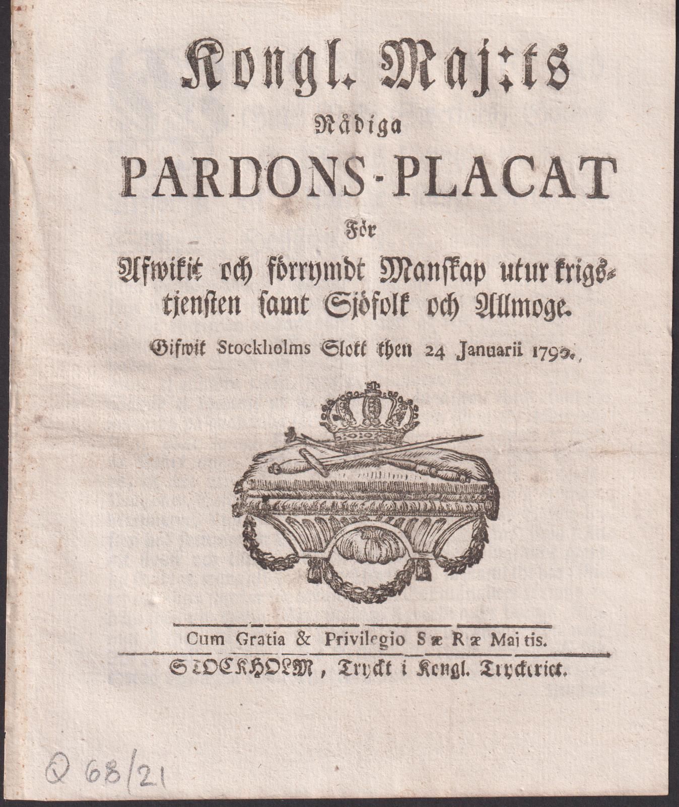 Kongl. Maj:ts Nådiga Pardons-Placat För Afwikit och förrymdt Manskap utur krigstjensten samt Sjöfolk och Allmoge. Gifwit Stockholms Slott then 24 Januarii 1790.