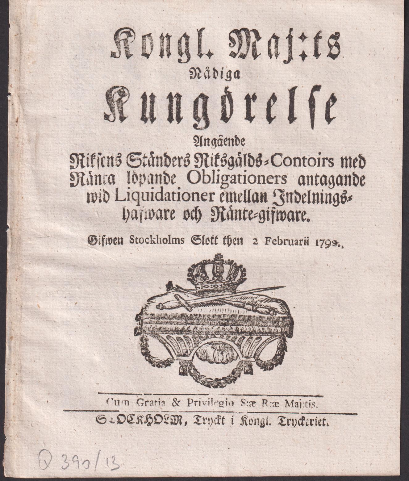 Kongl. Maj:ts Nådiga Kungörelse Angående Riksens Ständers Riksgälds-Contoirs med Ränta löpande Obligationers antagande wid Liquidationer emellan Indelningshafware och Ränte-gifware. Gifwen Stockholms Slott then 2 Februarii 1790.