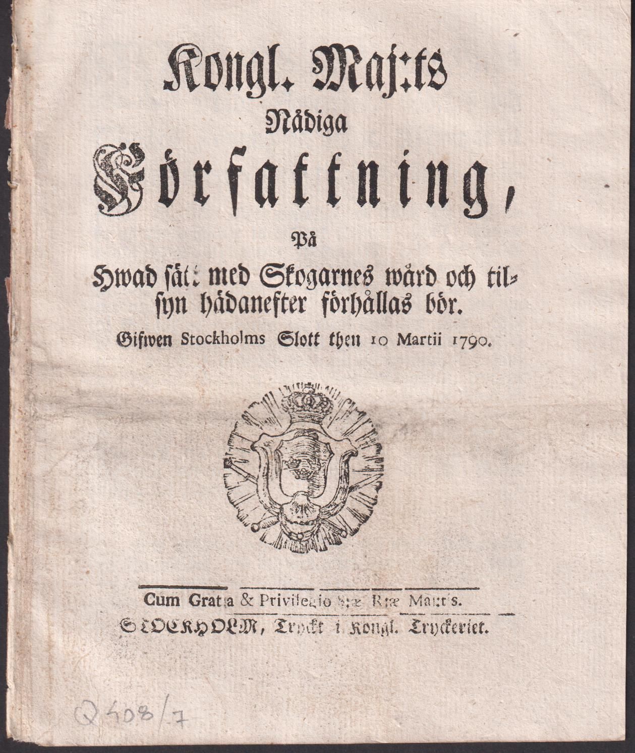 Kongl. Maj:ts Nådiga Författning, På Hwad sätt med Skogarnes wård och tilsyn hädanefter förhållas bör. Gifwen Stockholms Slott then 10 Martii 1790.