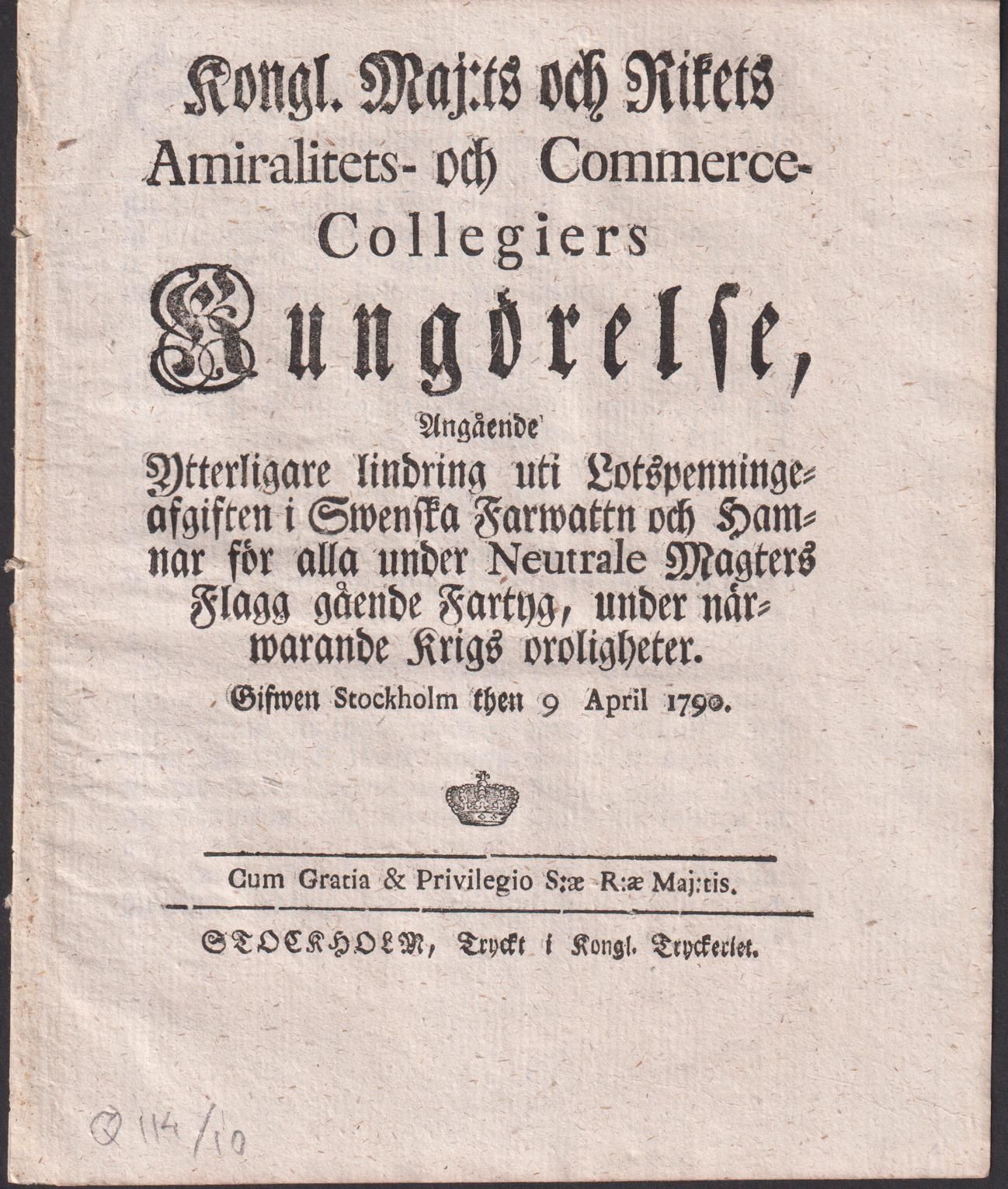 Kongl. Maj:ts och Rikets Amiralitets- och Commerce-Collegiers Kungörelse, Angående Ytterligare lindring uti Lotspenningeafgiften i Swenska Farwattn och Hamnar för alla under Neutrale Magters Flagg gående Fartyg, under närwarande Krigs oroligheter. Gifwen Stockholm then 9 April 1790.