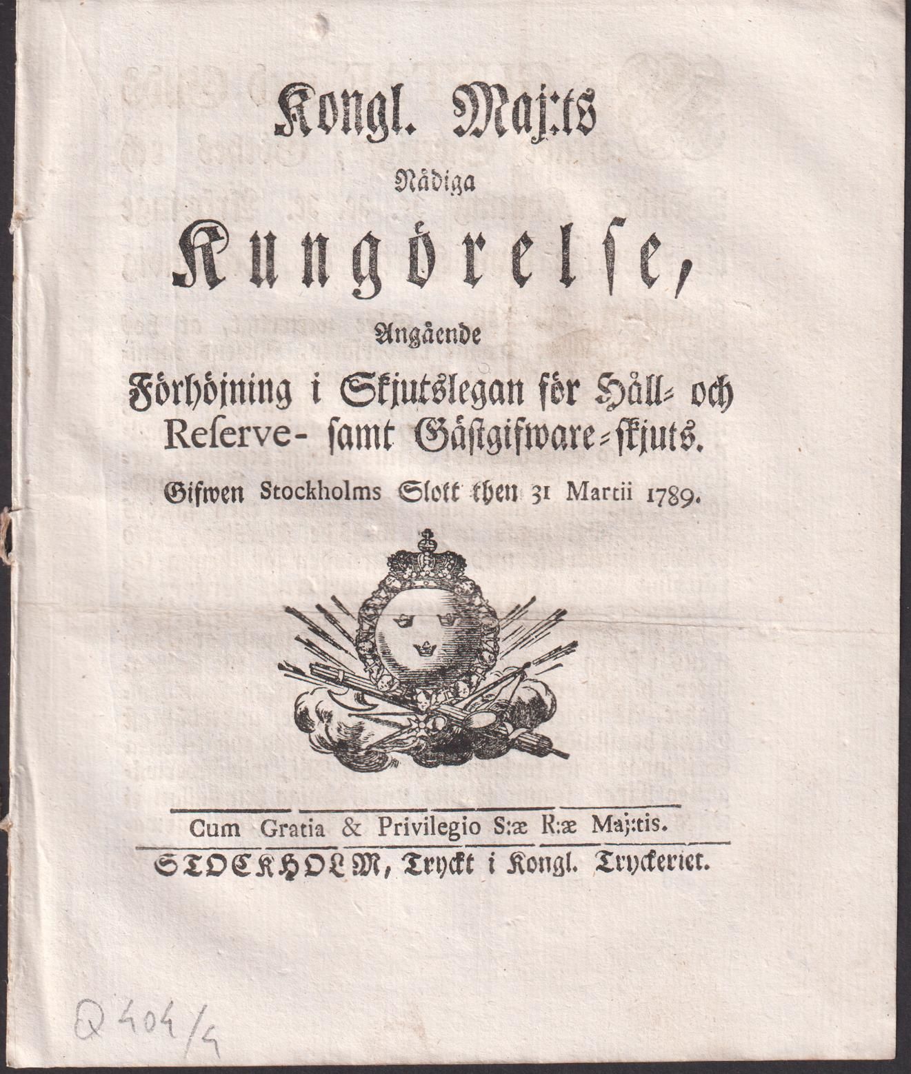 Kongl. maj.ts nådiga kungörelse, angående förhöjning i skjutslegan för håll- och reserve- samt gästgifware-skjuts. Gifwen Stockholms slott then 31 martii 1789.