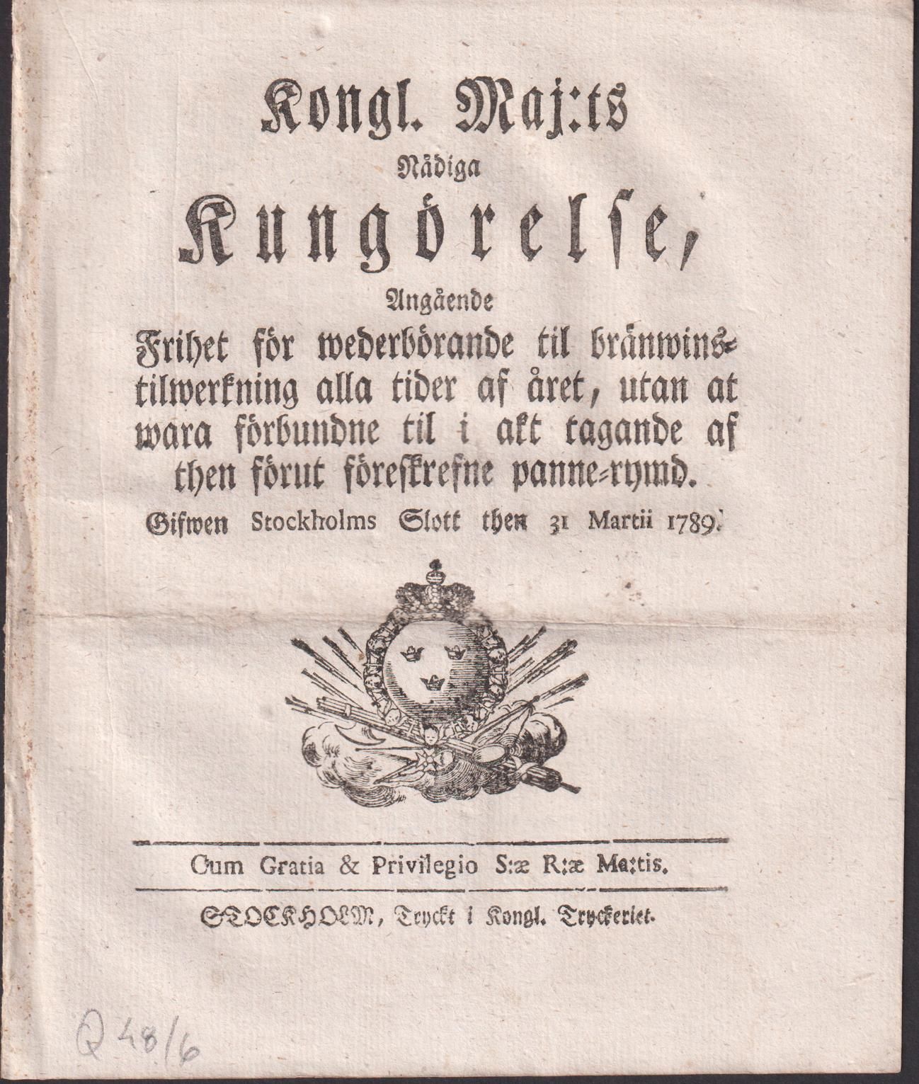 Kongl. Maj:ts Nådiga Kungörelse, Angående Frihet för wederbörande til bränwinstilwerkning alla tider af året, utan at wara förbundne til i akt tagande af then förut föreskrefne panne-rymd. Gifwen Stockholms Slott then 31 Martii 1789.