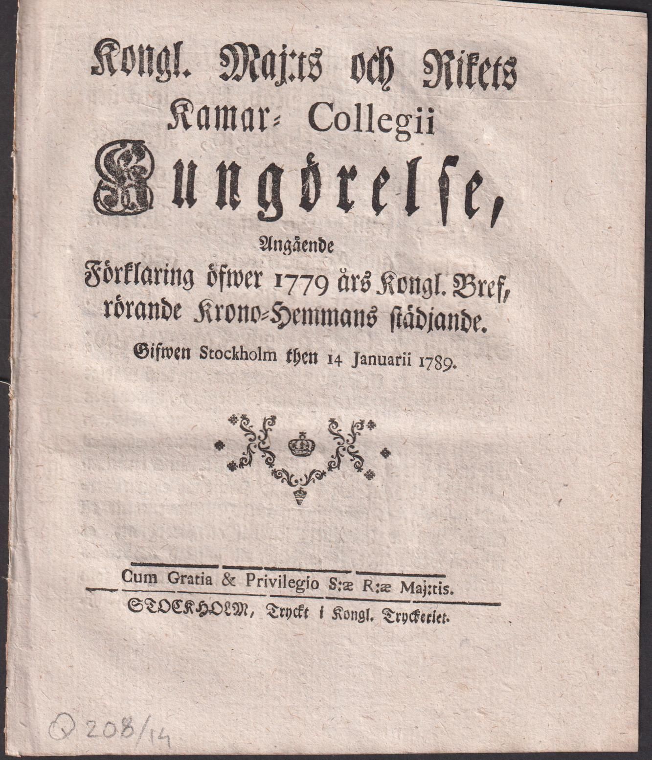 Kongl. Maj:ts och Rikets Kamar-Collegii Kungörelse, Angående Förklaring öfwer 1779 års Kongl. Bref, rörande Krono-Hemmans städjande. Gifwen Stockholm then 14 Januarii 1789.