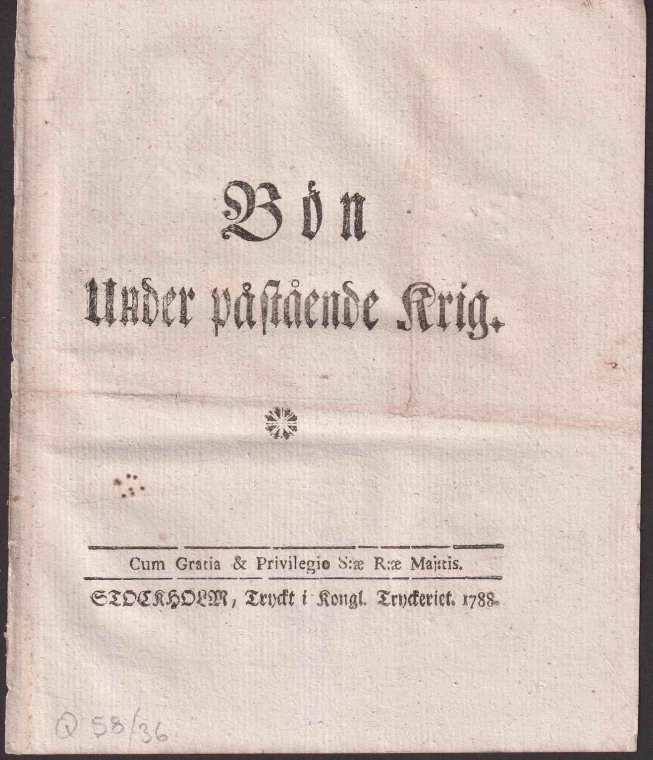 Quiding ‘Svenskt allmänt författningsregister ...’ s. 58:36. Texten å sid. börjar: Herre! Tu store och nådefulle Gud! Tu som efter Tit wisa råd bereder rikens upkomst och fall! ...