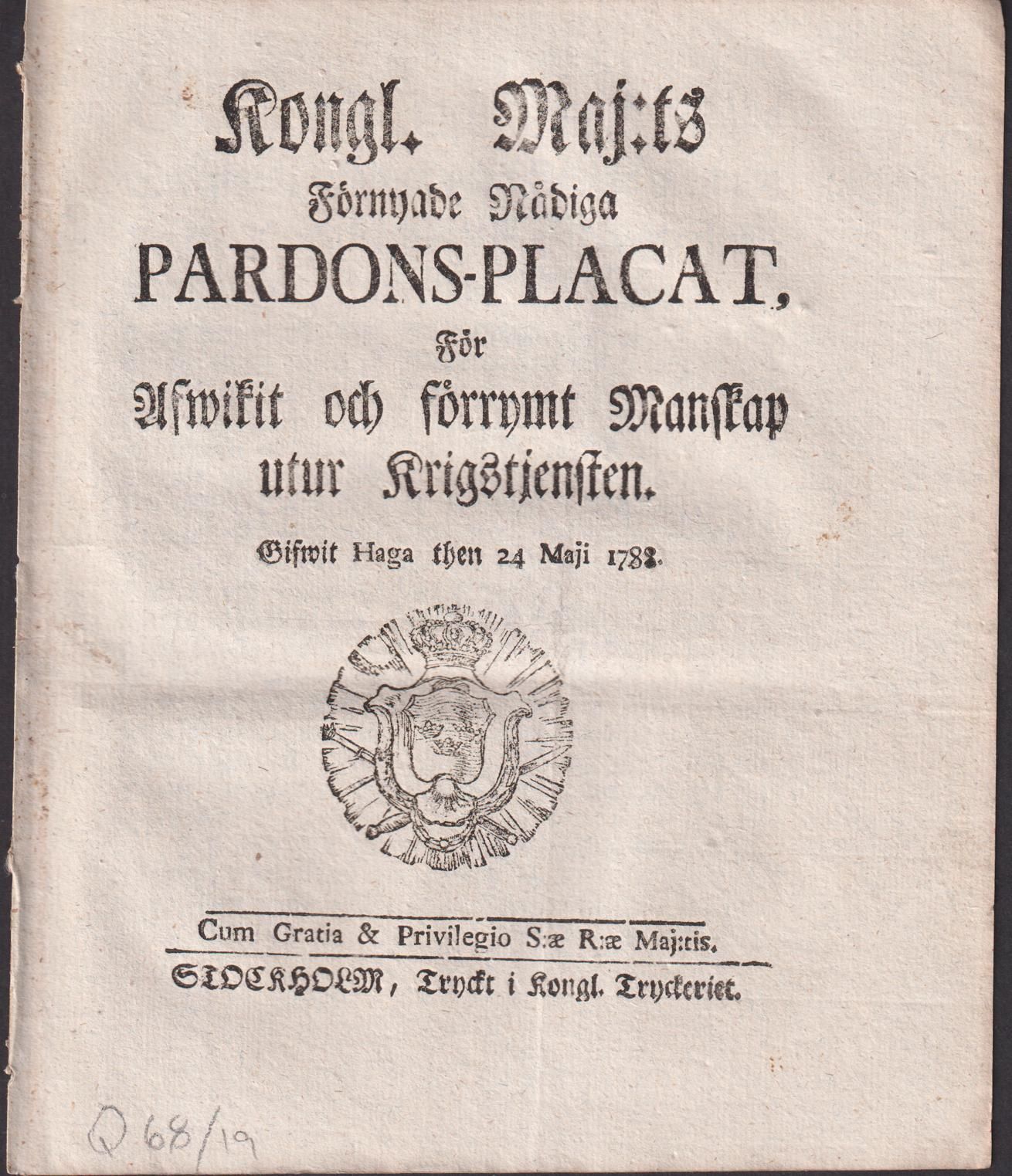 Kongl. Maj:ts Förnyade Nådiga Pardons-Placat, För Afwikit och förrymt Manskap utur Krigstjensten. Gifwit Haga then 24 Maji 1788.