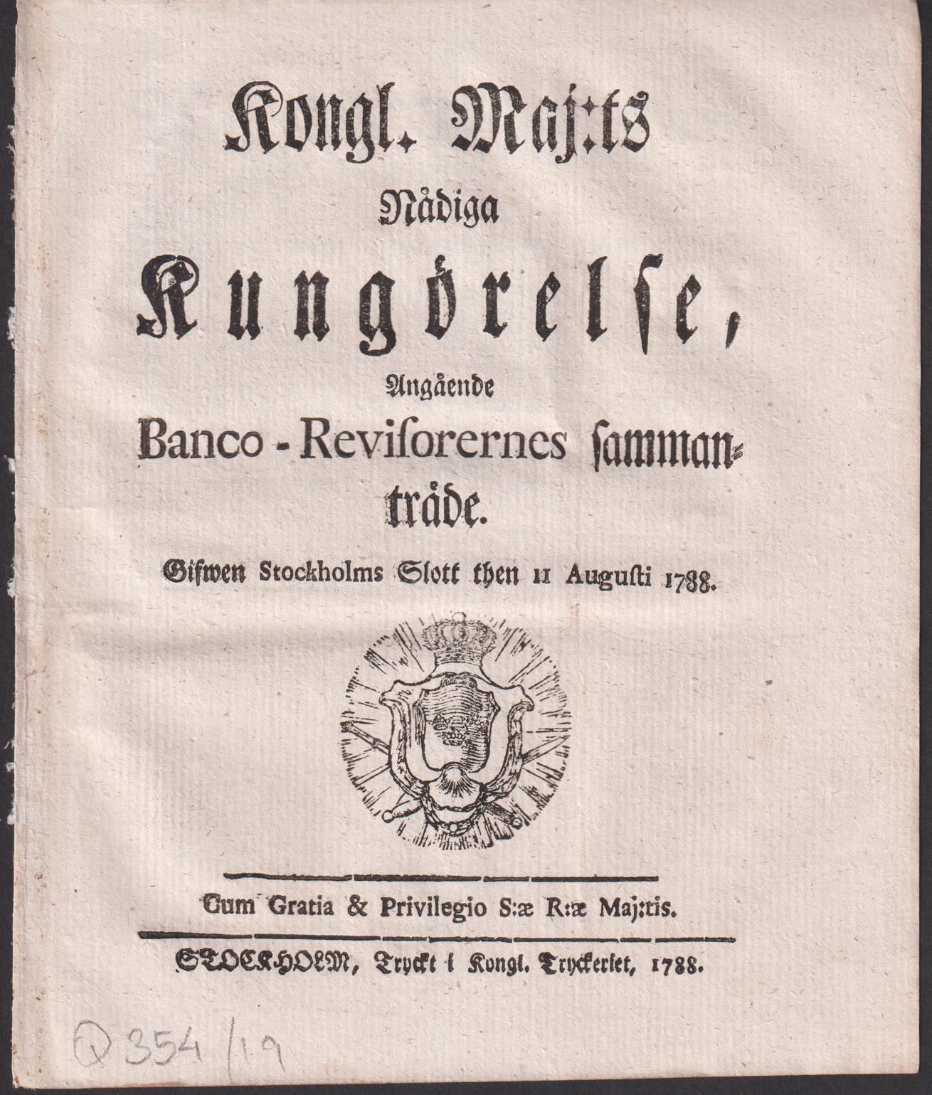 Kongl. Maj:ts Nådiga Kungörelse, Angående Banco-Revisorernes sammanträde. Gifwen Stockholms Slott then 11 Augusti 1788.