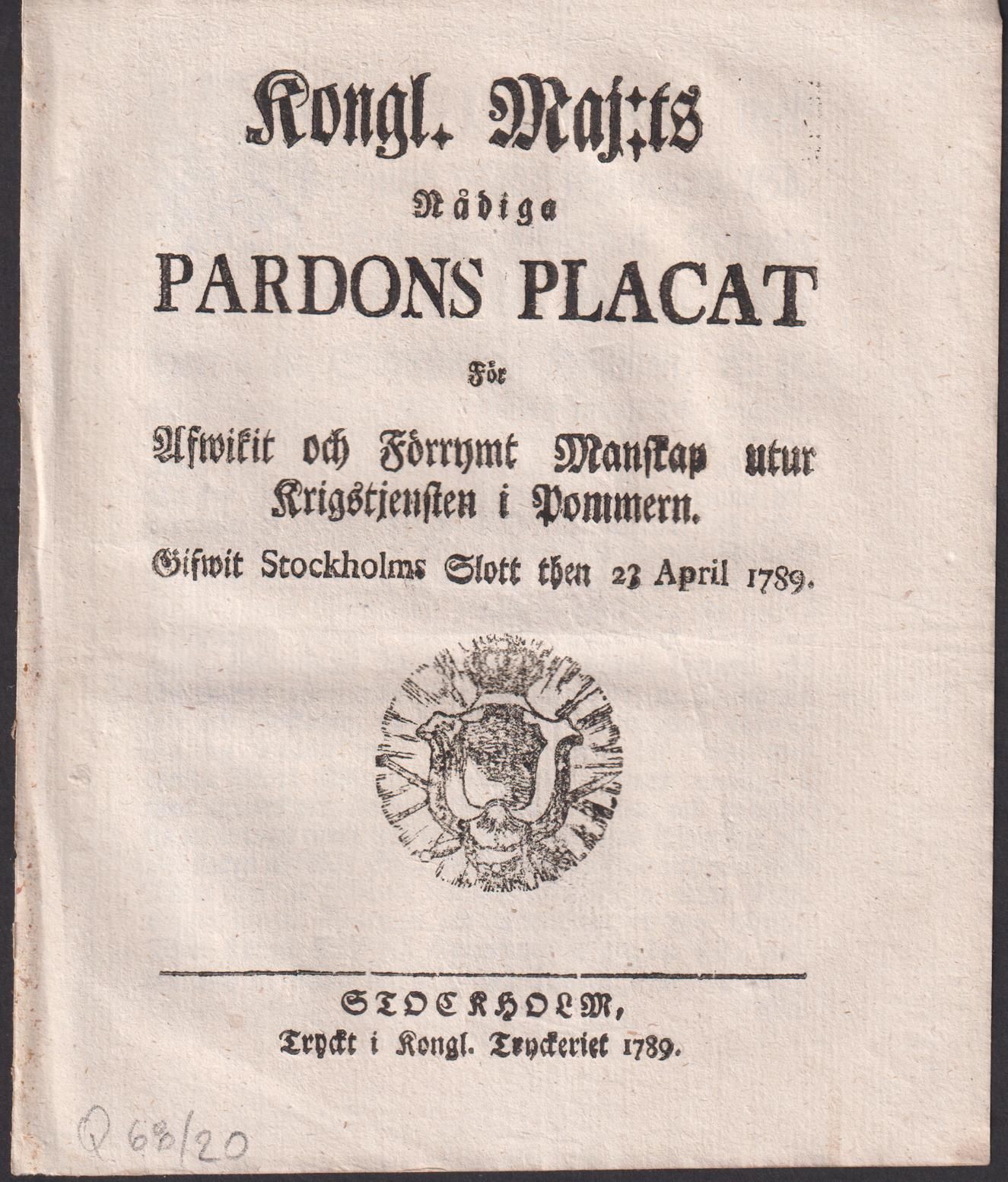 Kongl. Maj:ts Nådiga Pardons Placat För Afwikit och Förrymt Manskap utur Krigstjensten i Pommern. Gifwit Stockholms Slott then 23 April 1789.