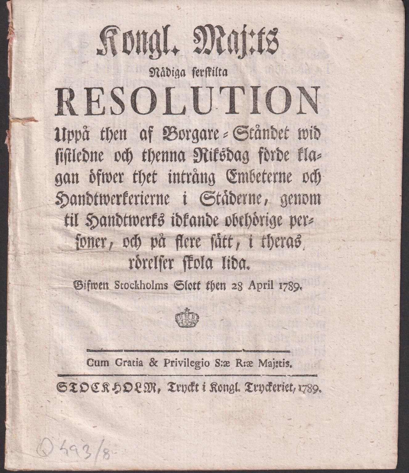 Kongl. maj:ts nådiga serskilta resolution uppå then af borgare-ståndet wid sistledne och thenna riksdag förde klagan öfwer thet intrång embeterne och handtwerkerierne i städerne, genom til handtwerks idkande obehörige personer, och på flere sätt, i theras rörelser skola lida. Gifwen Stockholms slott then 28 april 1789.