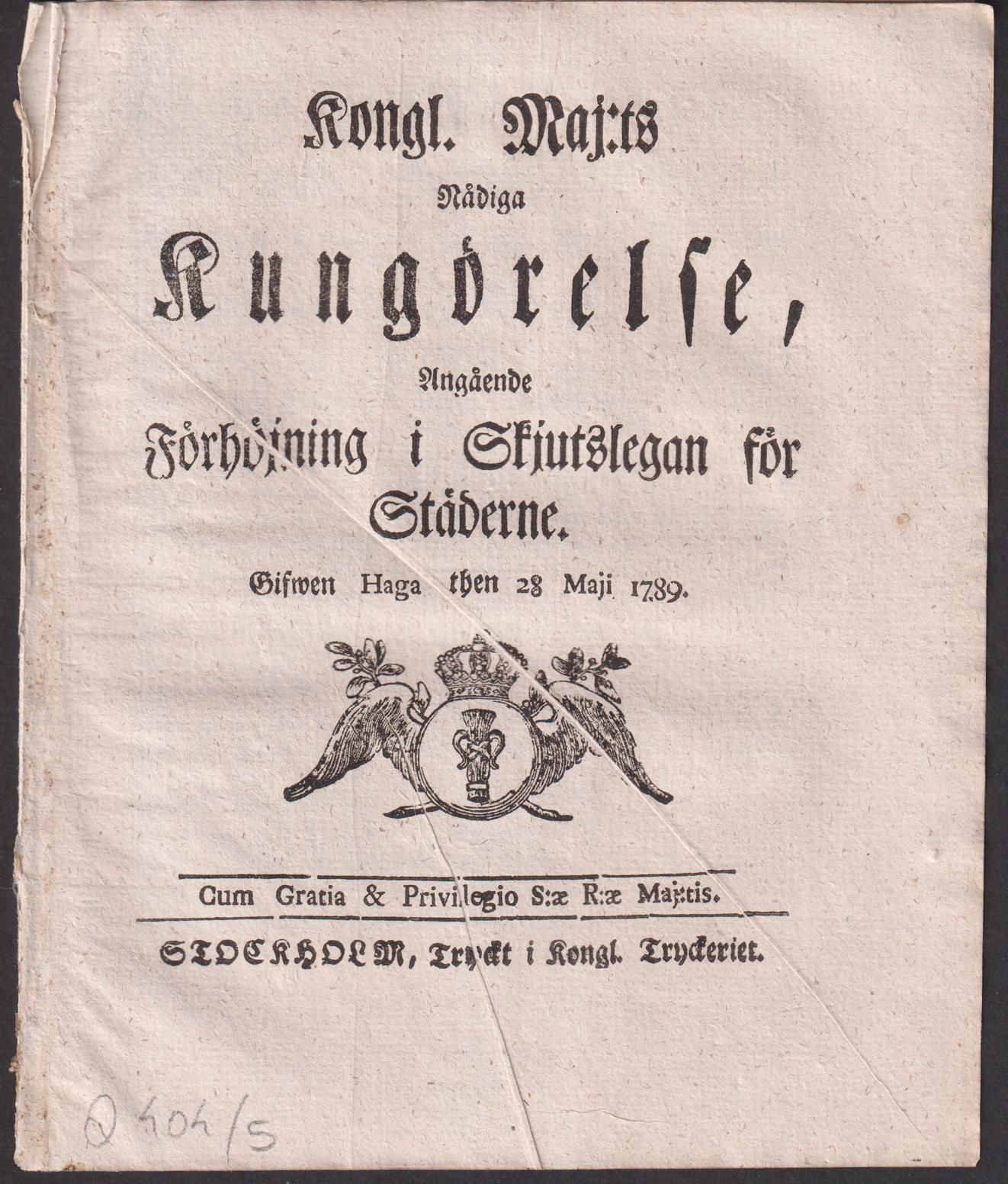 Kongl. Maj:ts Nådiga Kungörelse, Angående Förhöjning i Skjutslegan för Städerne. Gifwen Haga then 28 Maji 1789.