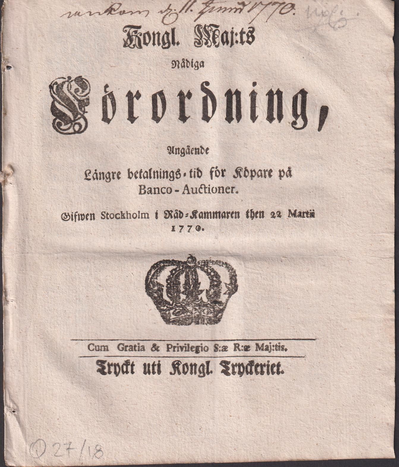 Kongl. maj:ts nådiga Förordning, Angående Längre betalnings-tid för Köpare på Banco-Auctioner. Gifwen Stockholm i Råd-Kammaren then 22 martii 1770.