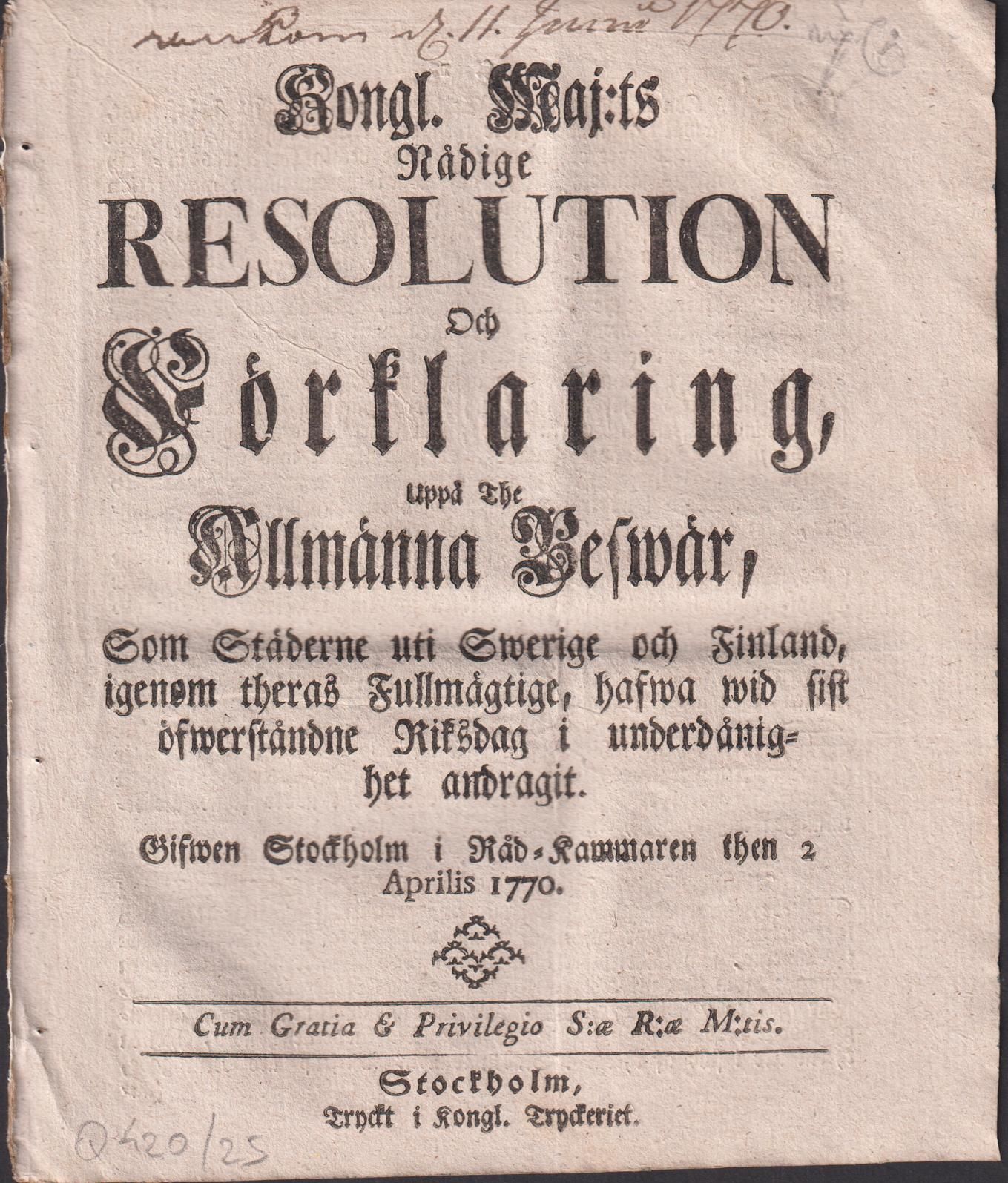 Kongl. maj:ts nådige resolution och förklaring, uppå the allmänna beswär, som städerne uti Swerige och Finland, igenom theras fullmägtige, hafwa wid sist öfwerståndne riksdag i underdånighet andragit. Gifwen Stockholm i råd-kammaren then 2 aprilis 1770.