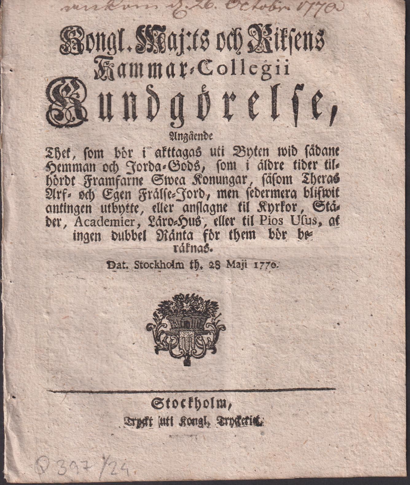Kongl. maj:ts och Riksens Kammar-Collegii Kundgörelse, Angående Thet, som bör i akttagas uti Byten wid sådane Hemman och Jorda-Gods, som i äldre tider tilhördt Framfarne Swea Konungar, såsom Theras Arf- och Egen Frälse-Jord, men sedermera blifwit antingen utbytte, eller anslagne til Kyrkor, Städer, Academier, Läro-Hus, eller til Pios Usus, at ingen dubbel Ränta för them bör beräknas. Dat. Stockholm th. 28 maji 1770.