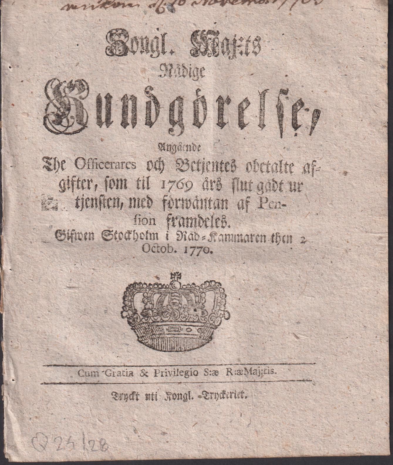 Kongl. maj:ts nådige Kundgörelse, Angående The Officerares och Betjentes obetalte afgifter, som til 1769 års slut gådt ur tjensten, med förwäntan af Pension framdeles. Gifwen Stockholm i Råd-Kammaren then 2 octob. 1770.