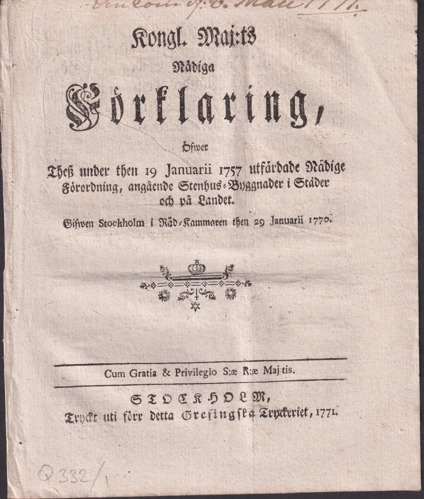 Kongl. maj:ts nådiga Förklaring, Öfwer Thesz under then 19 Januarii 1757 utfärdade Nådige Förordning, angående Stenhus-Byggnader i Städer och på Landet. Gifwen Stockholm i Råd-Kammaren then 29 januarii 1770.