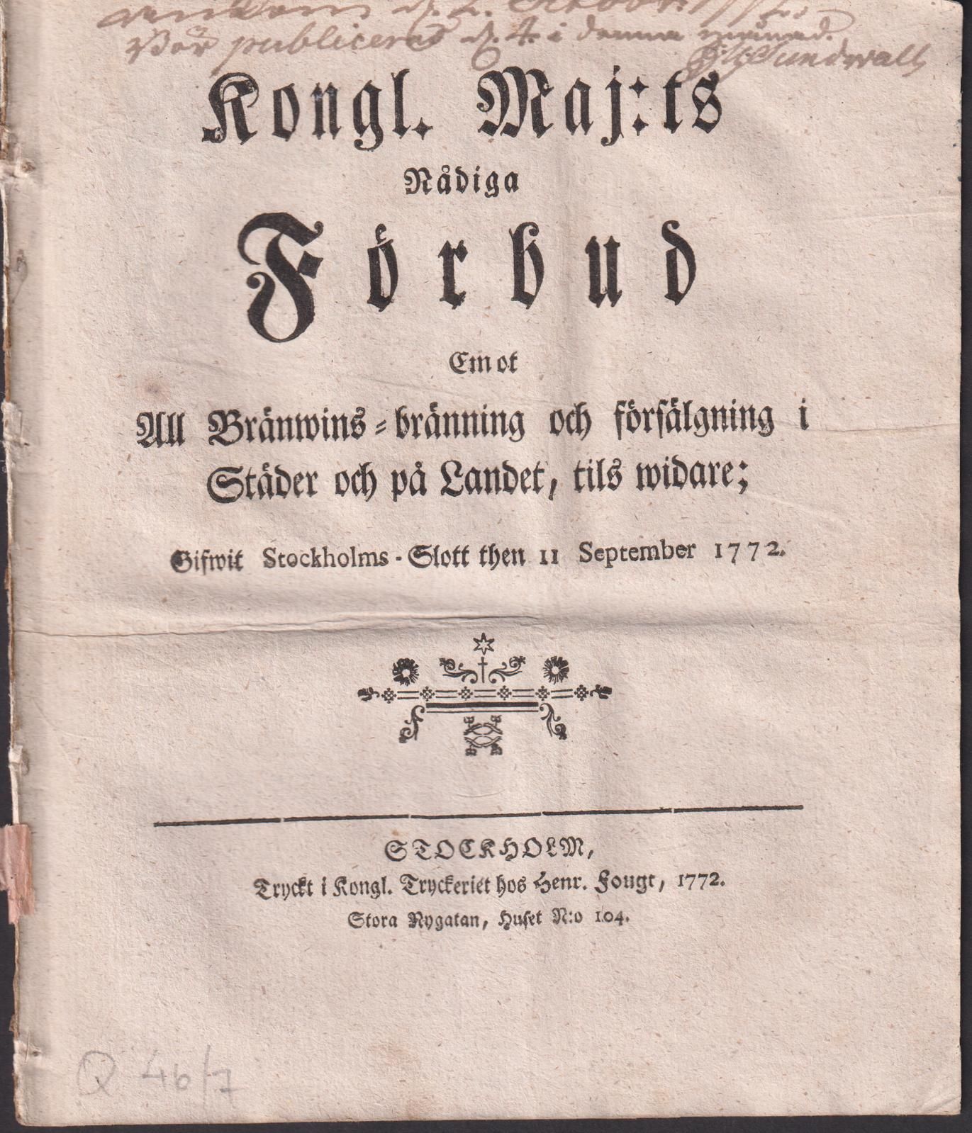 Kongl. Maj:ts Nådiga Förbud Emot All Bränwins-bränning och försälgning i Städer och på Landet, tils widare; Gifwit Stockholms Slott then 11 September 1772.