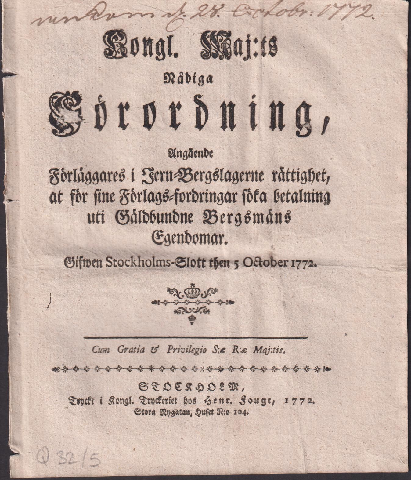 Kongl. Maj:ts Nådiga Förordning, Angående Förläggares i Jern-Bergslagerne rättighet, at för sine Förlags-fordringar söka betalning uti Gäldbundne Bergsmäns Egendomar. Gifwen Stockholms-Slott then 5 October 1772.