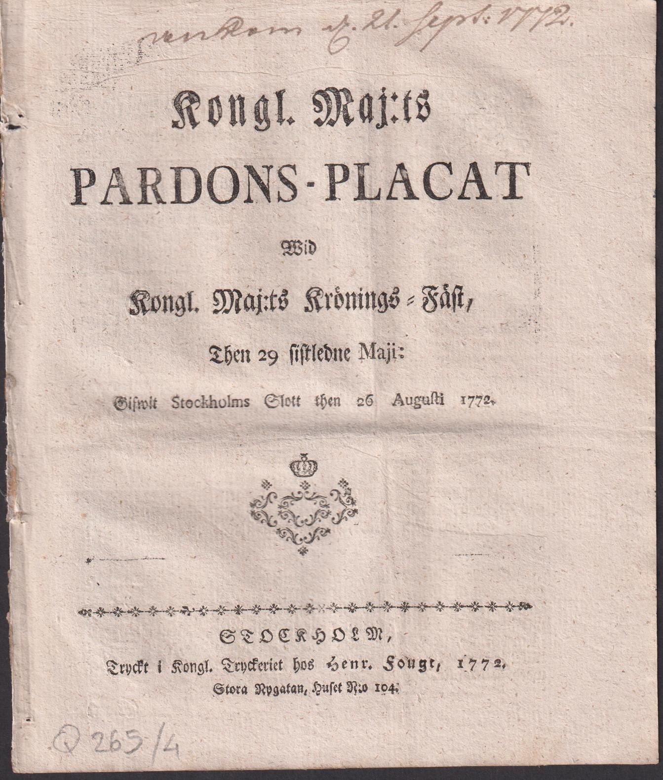Kongl. Maj:ts Pardons-Placat Wid Kongl. Maj:ts Krönings-Fäst, Then 29 sistledne Maji: Gifwit Stockholms Slott then 26 Augusti 1772.