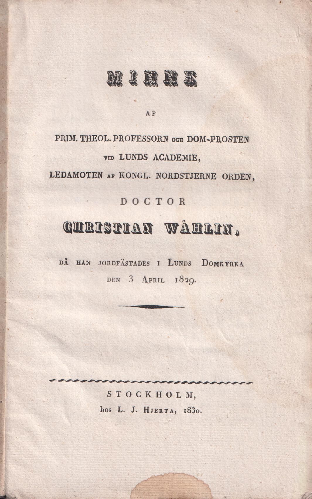 Minne af prim. theol. professorn och dom-prosten vid Lunds Academie, ledamoten af Kongl. Nordstjerne orden, doctor Christian Wåhlin, då han jordfästades i Lunds domkyrka den 3 april 1829.