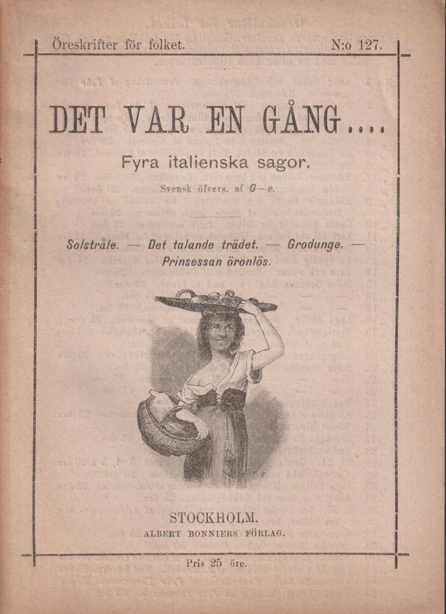 Det var en gång .... Italienska sagor. Svensk översättning af G-e. Med 7 originalteckningar. [Utg. av] Albert Bonniers Förlag.