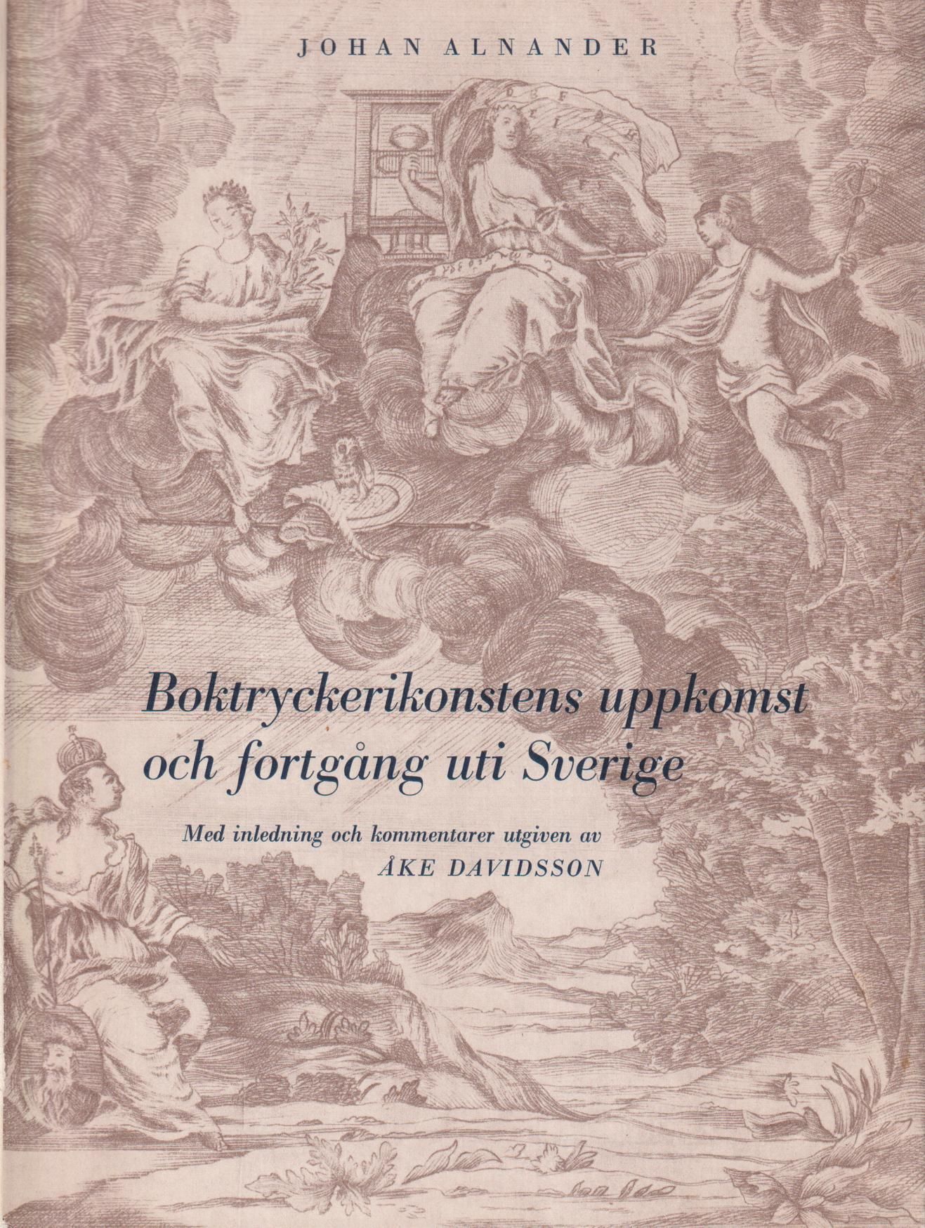 Boktryckerikonstens uppkomst och fortgång uti Sverige. [Först på latin föreställt. Övers. och tillökt av Samuel Alnander]. Med inledning och kommentarer utgiven av Åke Davidsson [genom] Allhems förlag.