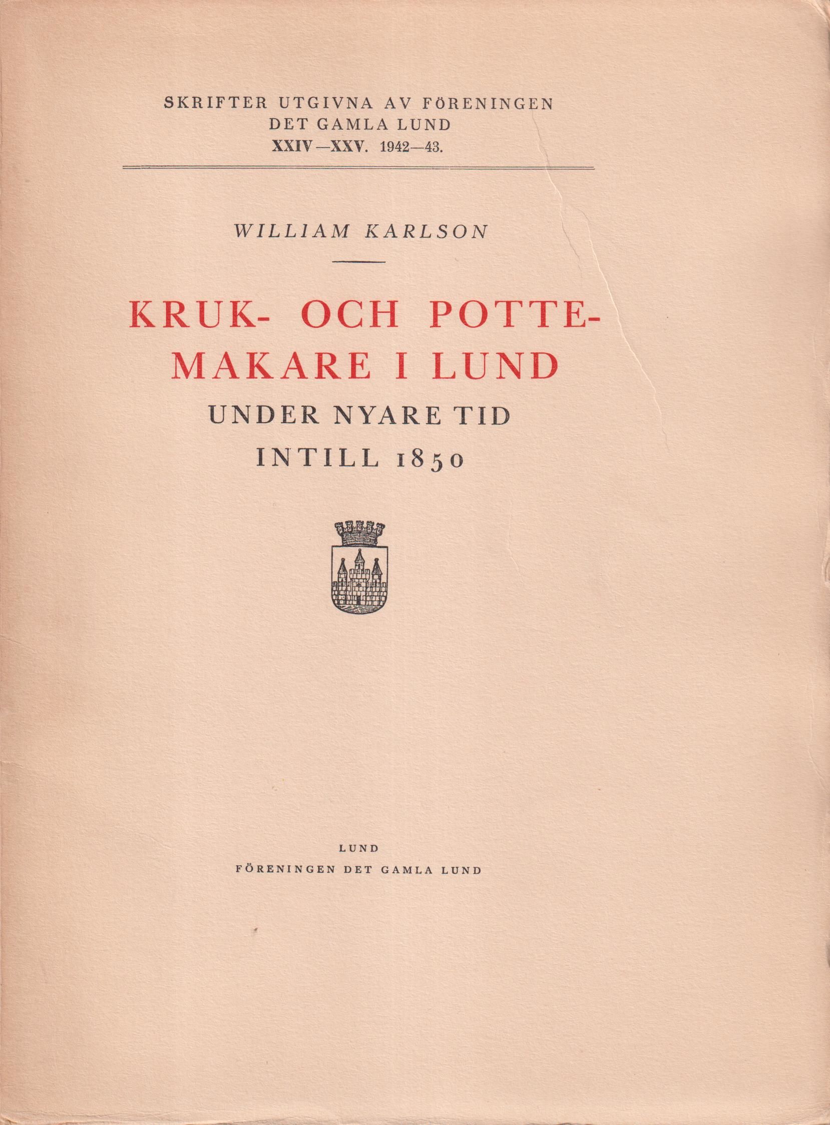 Kruk- och pottemakare i Lund under nyare tid intill 1850. [Utg. av] Föreningen Det Gamla Lund.