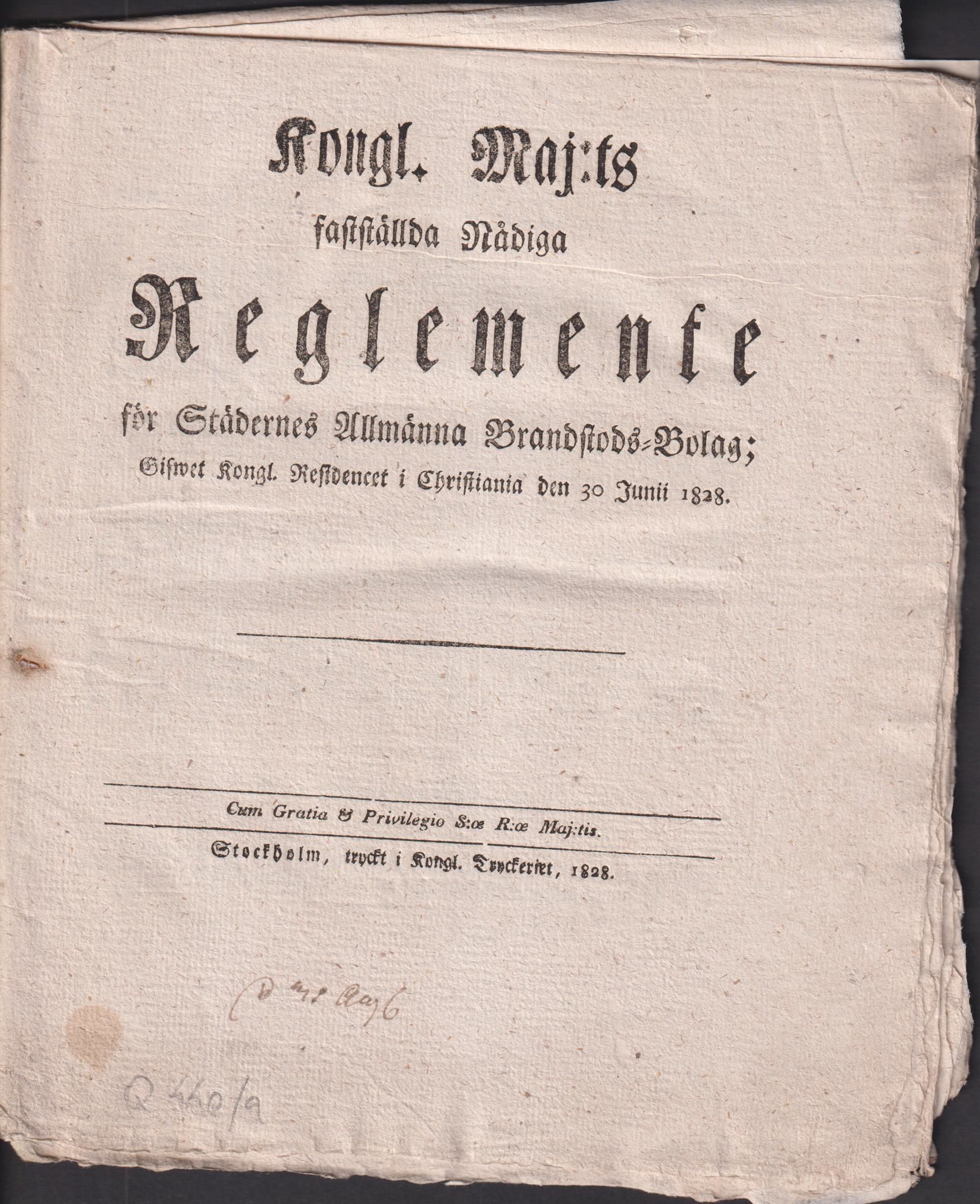 Kongl. Maj:ts fastställda nådiga Reglemente för Städernes Allmänna Brandstods-Bolag; Gifwet Kongl. residencet i Christiania den 30 junii 1828.