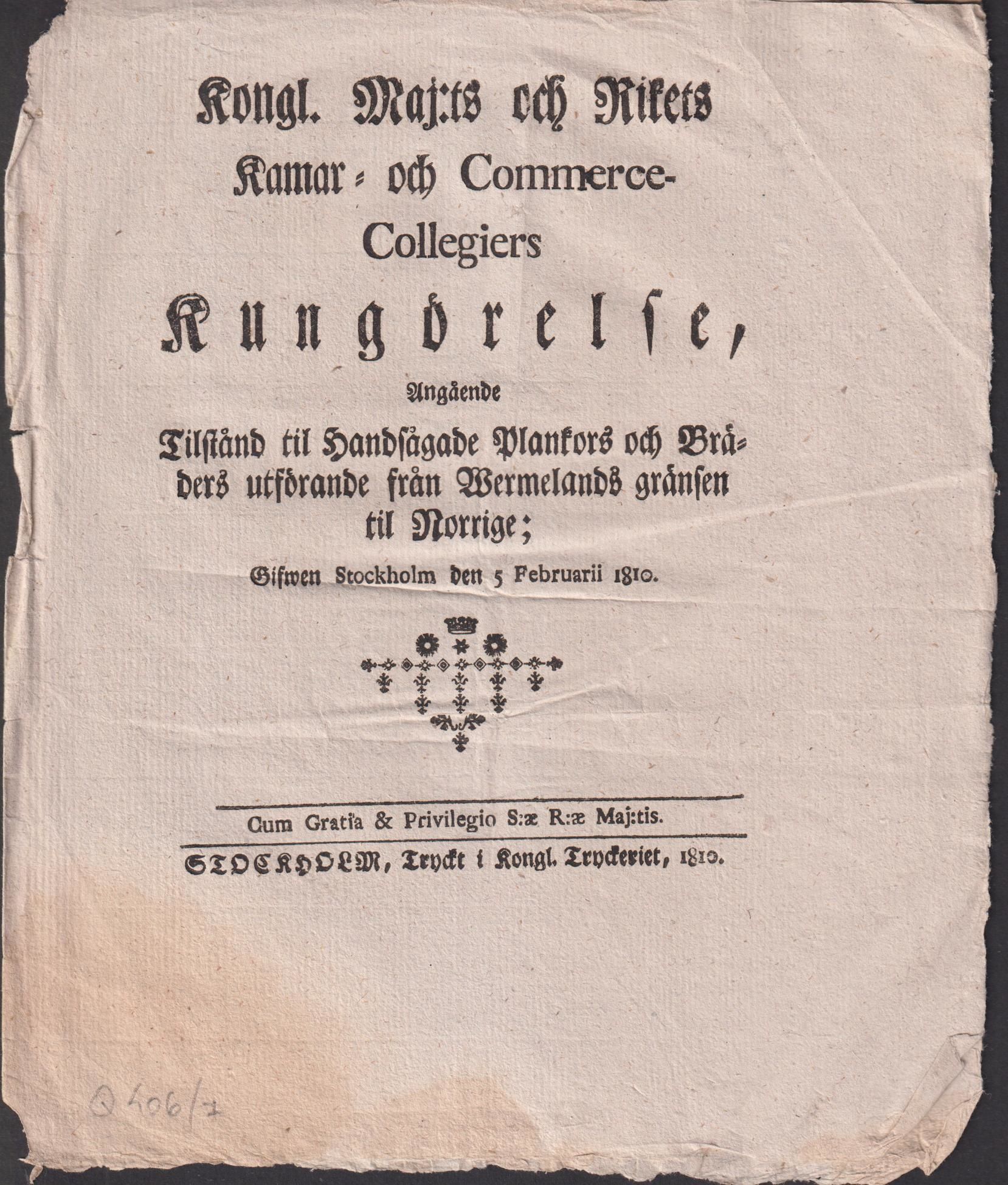 Kongl. Maj:ts och Rikets Kamar- och Commerce-Collegiers Kungörelse, Angående Tilstånd til Handsågade Plankors och Bräders utförande från Wermelands gränsen til Norrige; Gifwen Stockholm den 5 Februarii 1810.