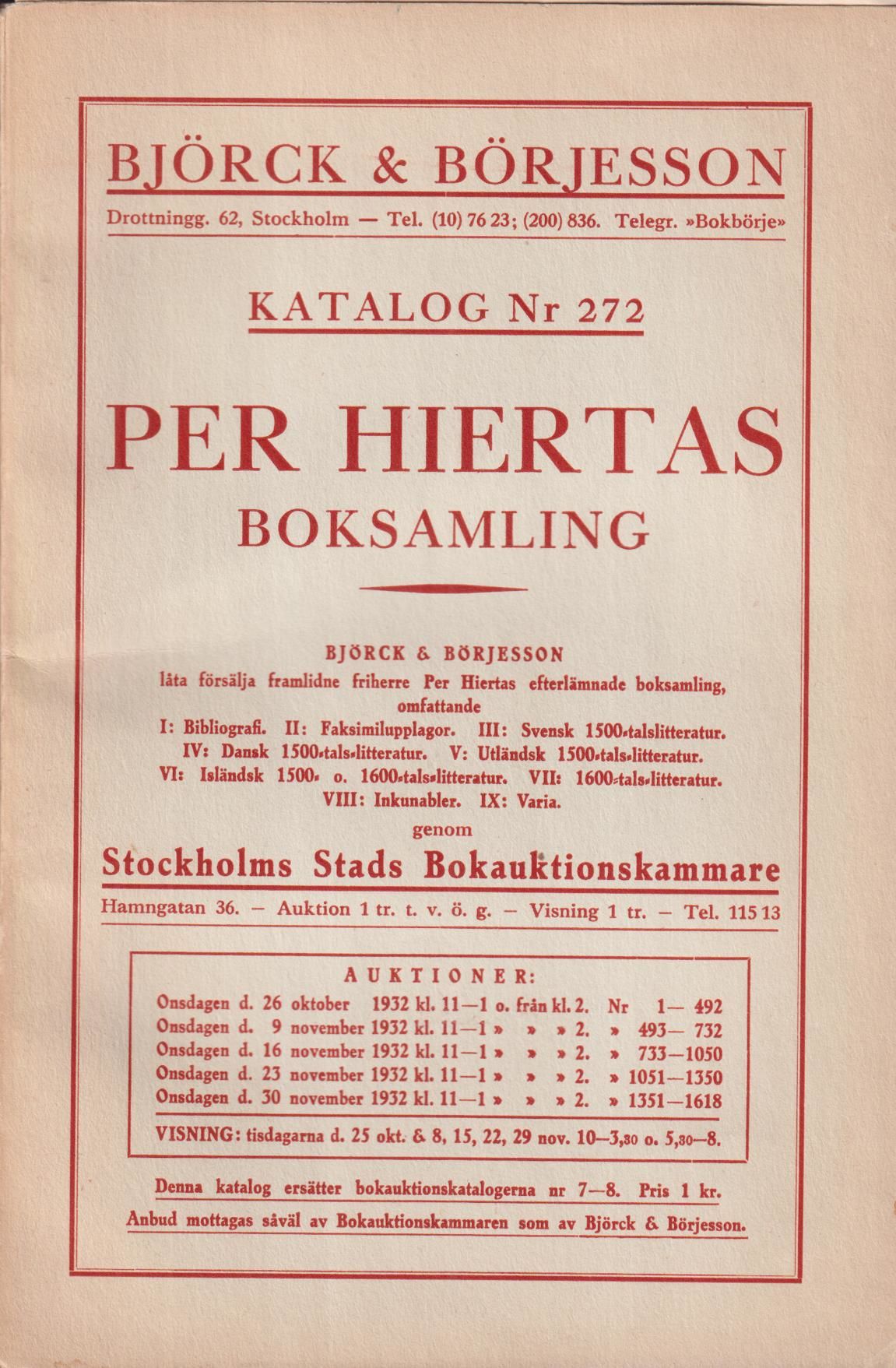 Katalog nr 272. Per Hiertas boksamling. Försäljning å Stockholms stads bokauktionskammare.