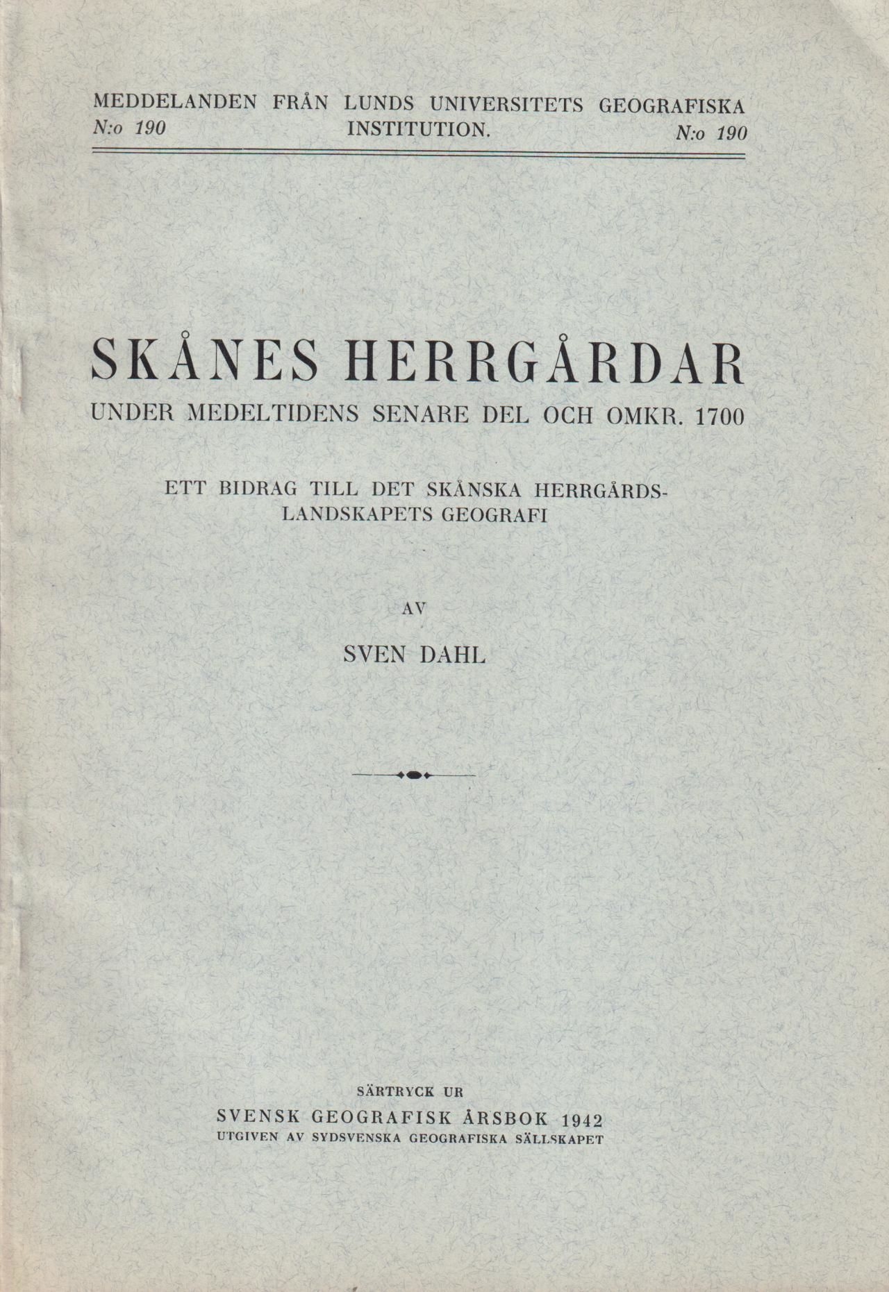 Skånes herrgårdar under medeltidens senare del och omkr. 1700. Ett bidrag till det skånska herrgårdslandskapets geografi [= rubrik].