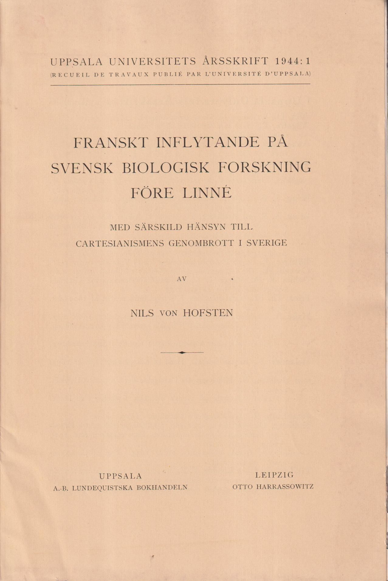 Franskt inflytande på svensk biologisk forskning före Linné. Med särskild hänsyn till cartesianismens genombrott i Sverige.