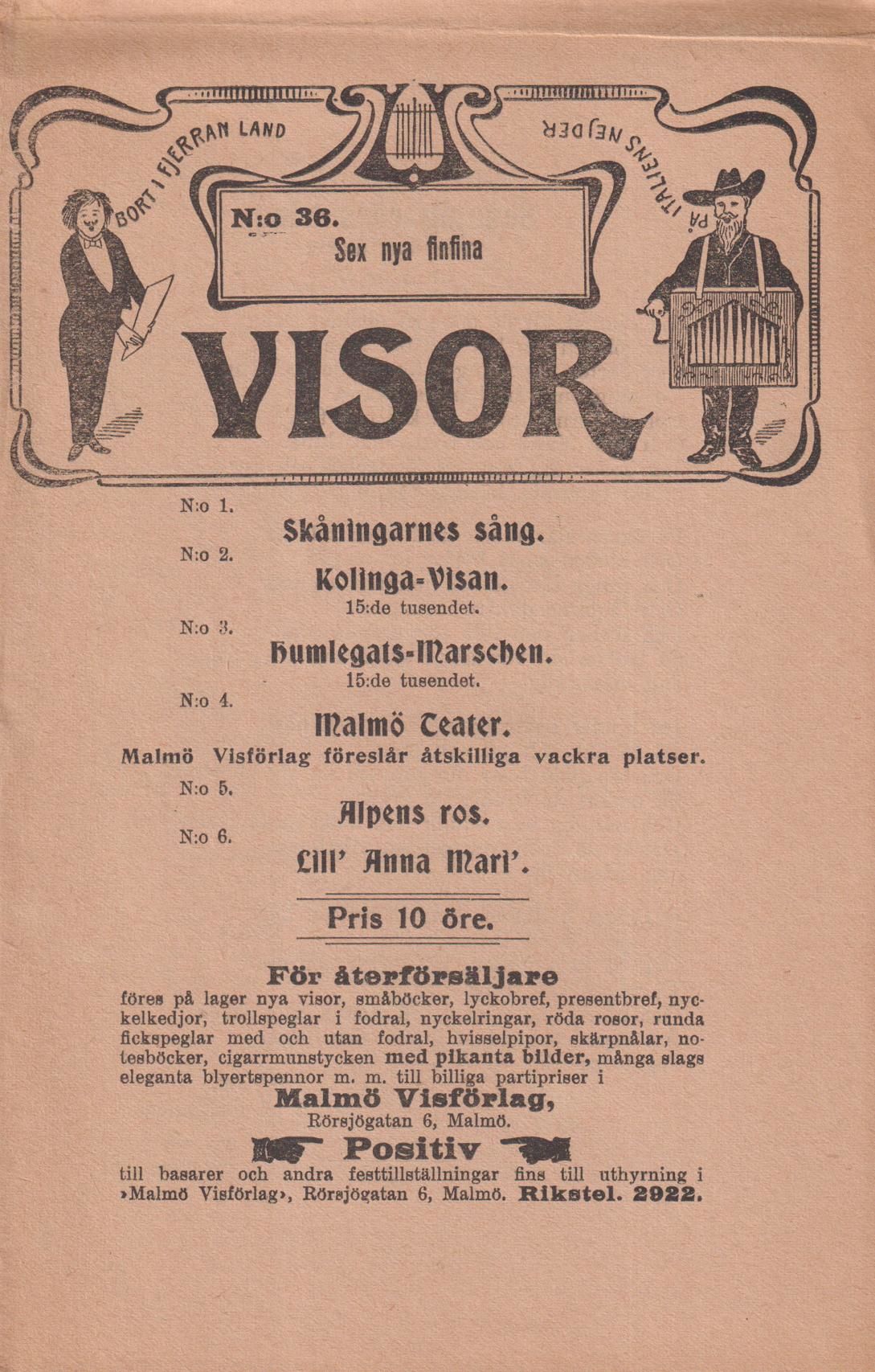 Danielson ‘Skillingtryckarna’ s. 158. N:o 36. Innehåll: 1. Skåningarnes sång. 2. Kolinga-Visan. 3. Humlegats-Marschen. 4. Malmö Teater. 5. Alpens ros. 6. Lill’ Anna Mari’.