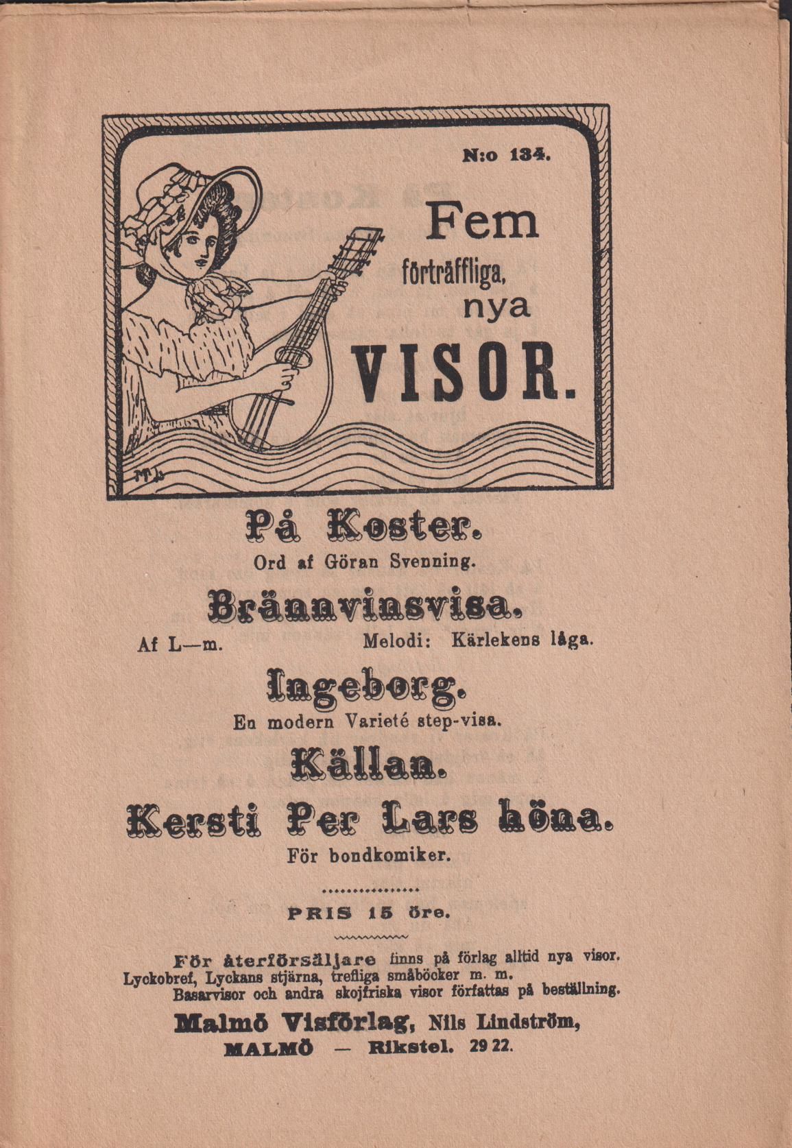 Danielson ‘Skillingtryckarna’ s. 159. Sista sidan med förlagsannonser. N:o 134. Innehåll: [1]. På Koster. Ord af Göran Svenning. [2]. Brännvinsvisa. Af L-m. [3]. Ingeborg. En modern Varieté step-visa. [4]. Källan. [5]. Kersti Per Lars höna. För bondkomiker.