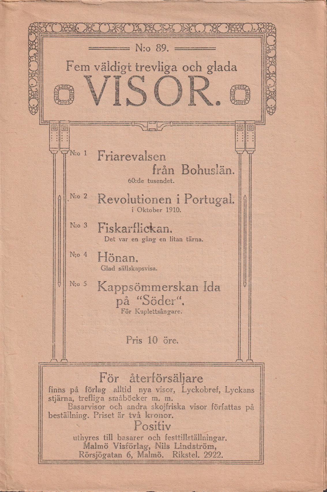 Danielson ‘Skillingtryckarna’ s. 106. Sista sidan med förlagsannonser. N:o 89. Innehåll: 1. Friarevalsen från Bohuslän. 2. Revolutionen i Portugal i oktober 1910. 3. Fiskarflickan. 4. Hönan. 5. Kappsömmerskan Ida från ‘Söder’. Eslövs Typografiska Anstalt verkar ha varit i produktion endast under perioden 1907-1911, se Danielson.