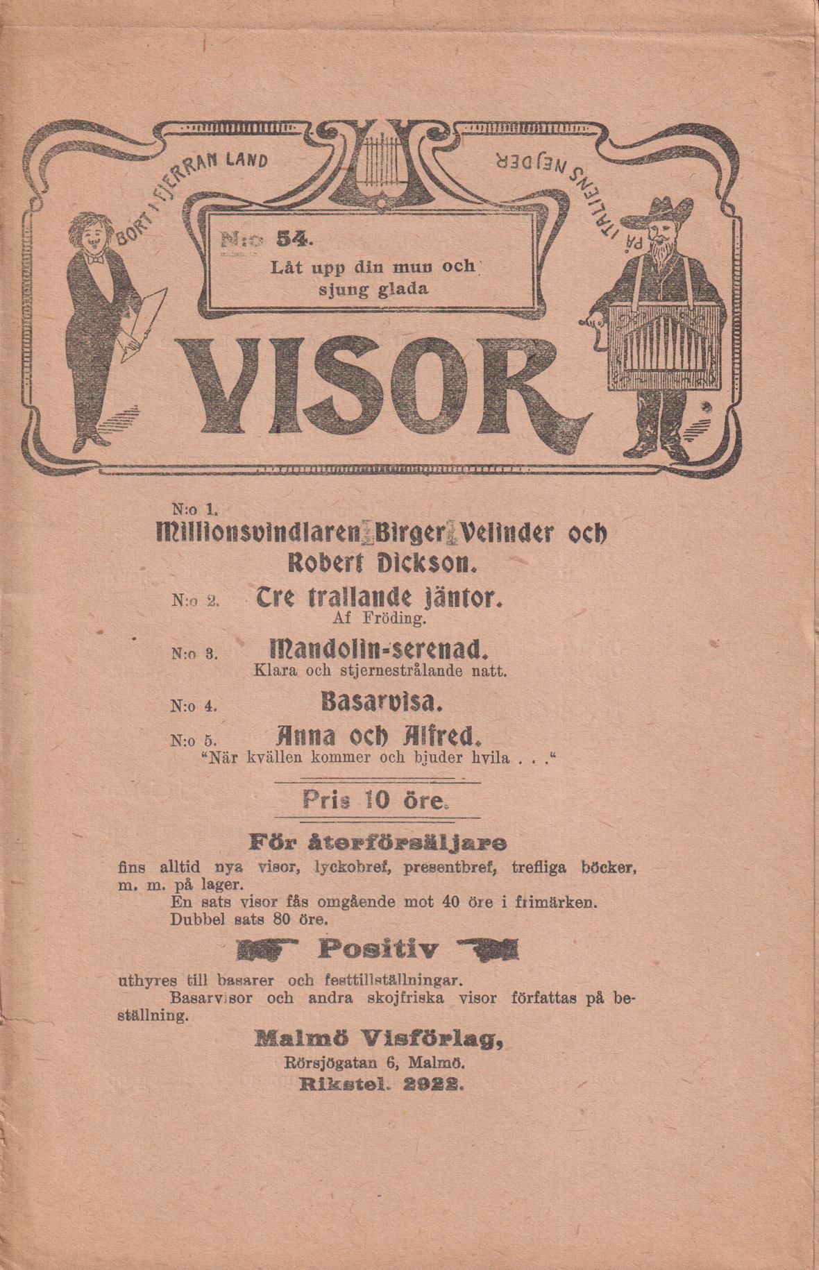 Danielson ‘Skillingtryckarna’ s. 158. Sista sidan med förlagsannonser. N:o 54. Innehåll: 1. Millionsvindlaren Birger Velinder och Robert Dickson. 2. Tre trallande jäntor. 3. Mandolin-serenad. 4. Basarvisa. 5. Anna och Alfred.