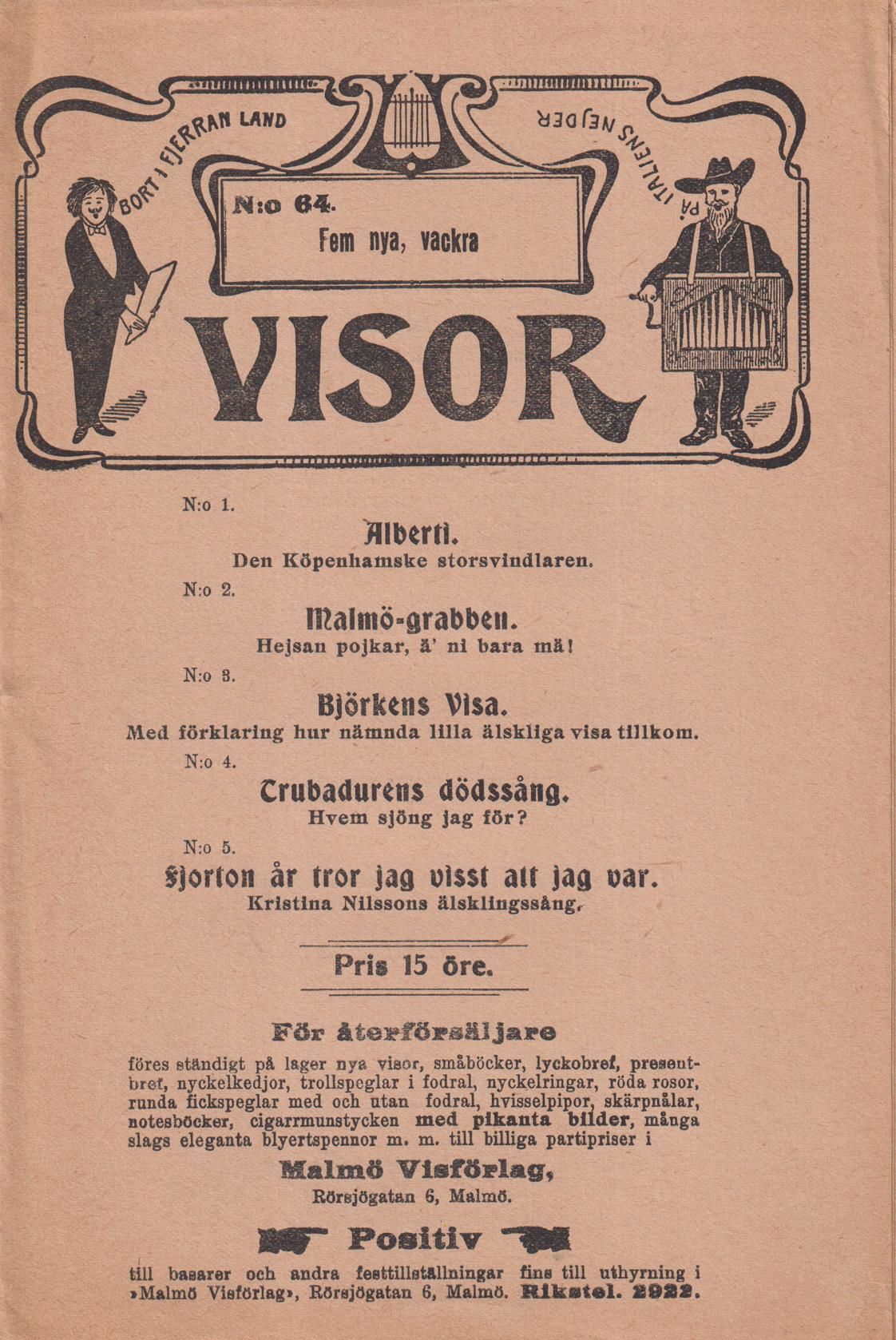Danielson ‘Skillingtryckarna’ s. 158. Sista sidan med förlagsannonser. N:o 64. Innehåll: 1. Alberti. Den Köpenhamske storsvindlaren. 2. Malmö-grabben. 3. Björkens visa. 4. Trubadurens dödssång. Hvem sjöng jag för? 5. Fjorton år tror jag visst att jag var.