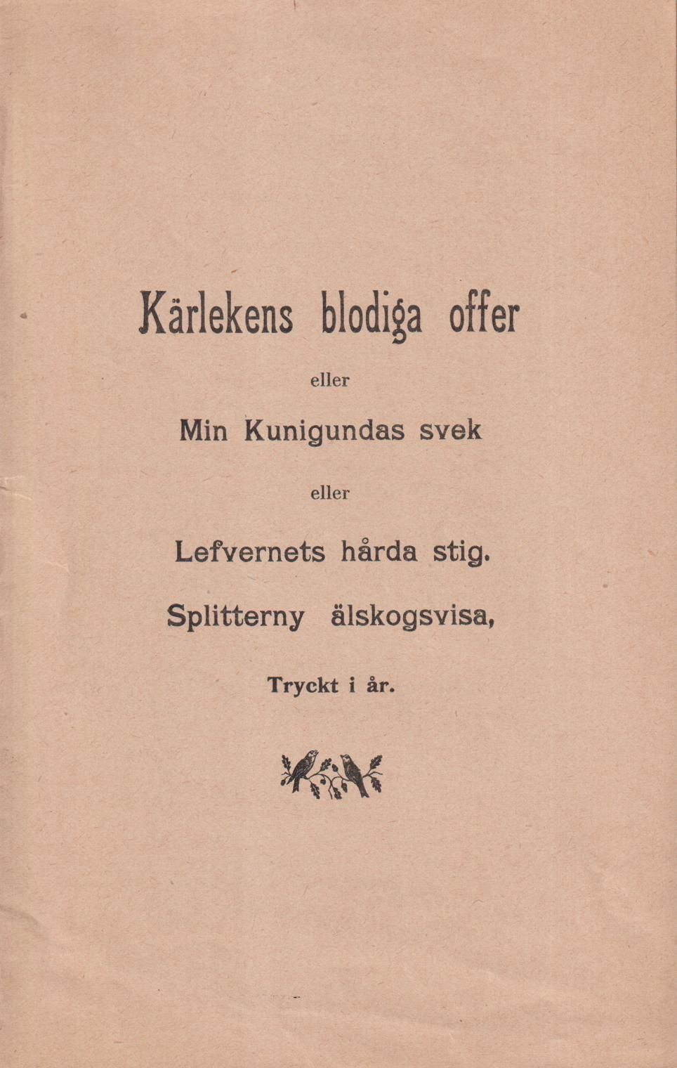 Kärlekens blodiga offer eller Min Kunigundas svek eller Lefvernets hårda stig. Splitterny älskogsvisa, Tryckt i år.