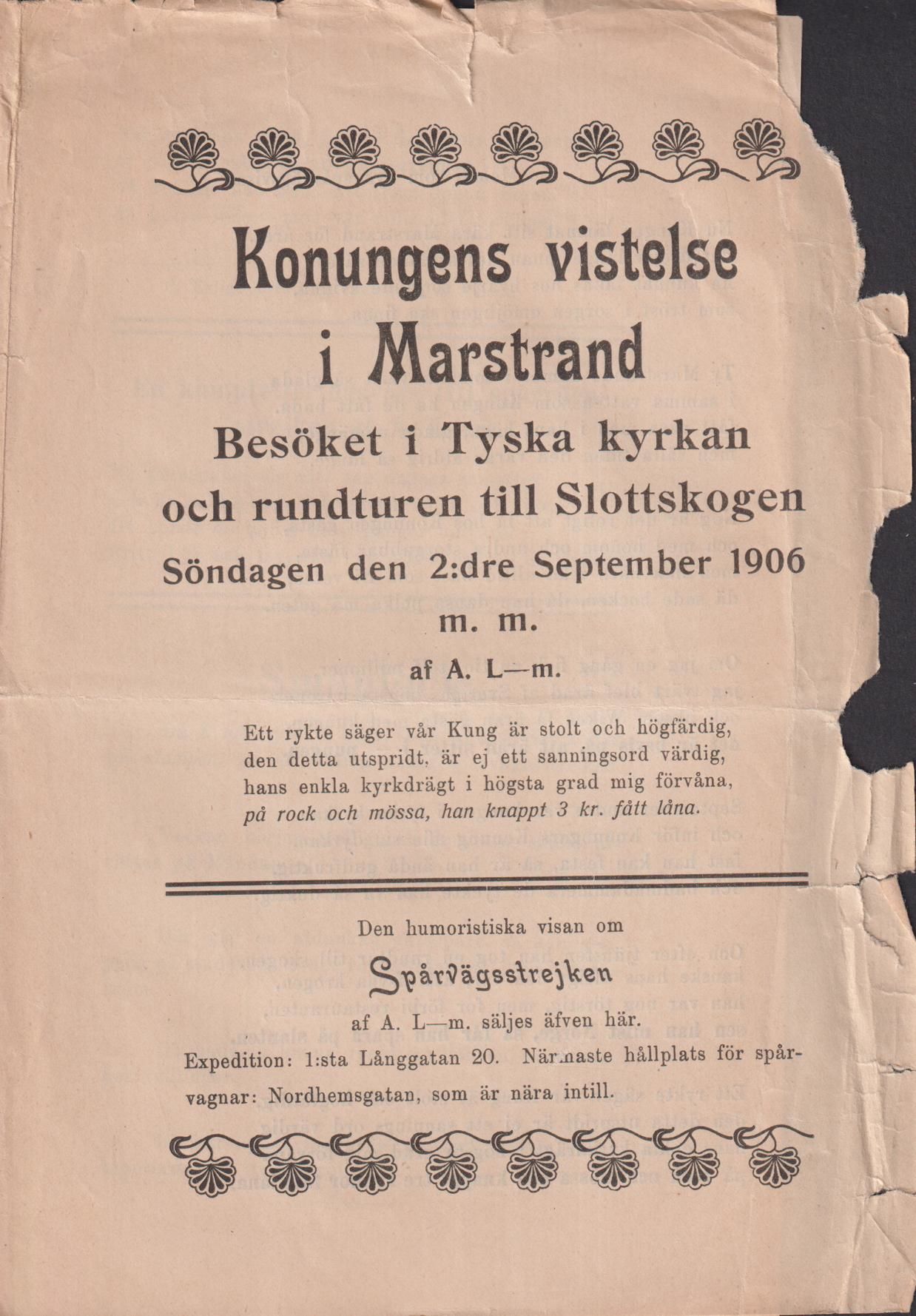 Konungens vistelse i Marstrand. Besöket i Tyska kyrkan och rundturen till Slottsskogen. Söndagen den 2:dre September 1906 m.m. af A. L-m.