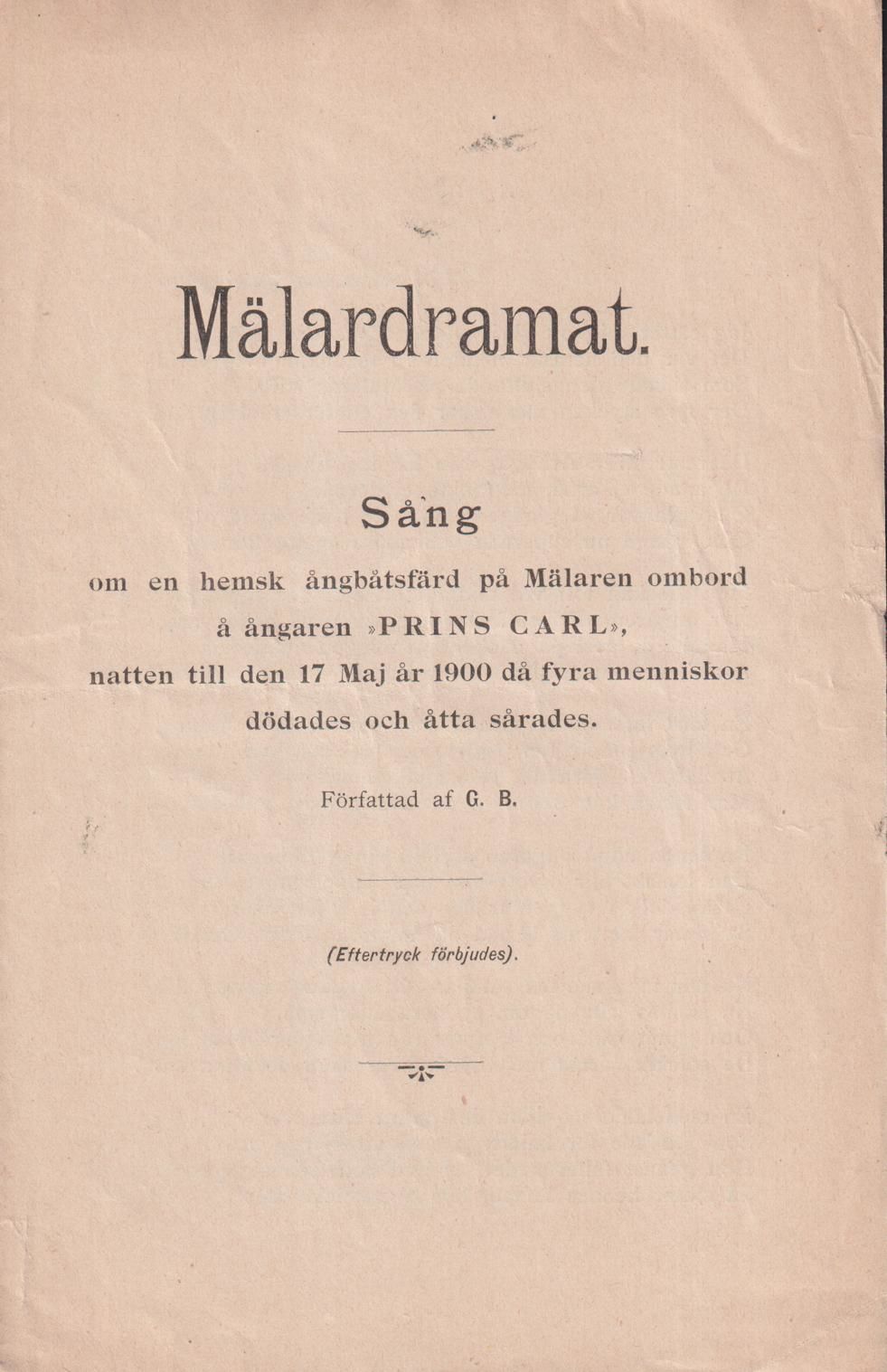Mälardramat. Sång om en hemsk ångbåtsfärd på Mälaren ombord å ångaren ‘Prins Carl’, natten till den 17 Maj år 1900 då fyra menniskor dödades och åtta sårades. Författad af G.B.