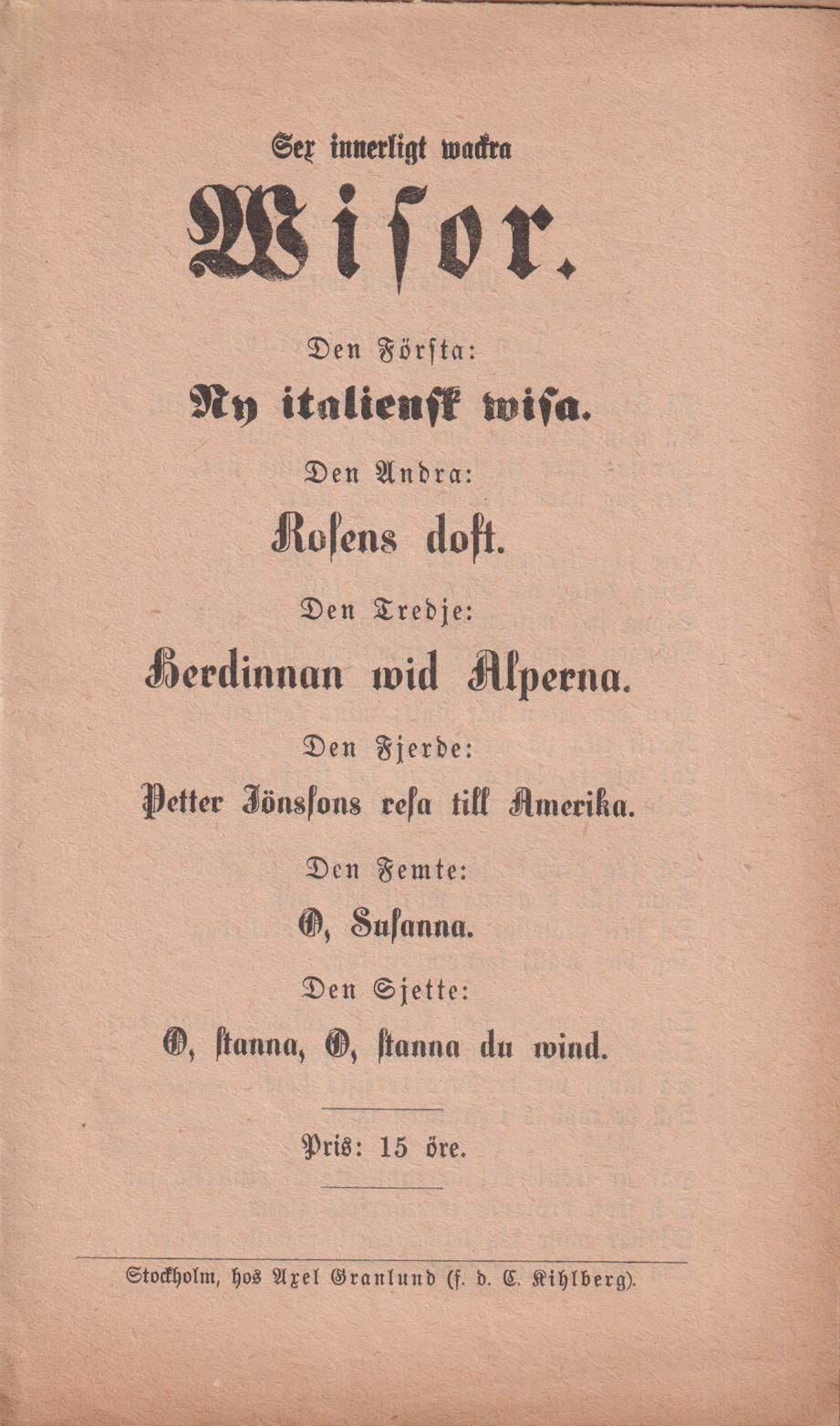 Danielson ‘Skillingtryckarna’ s. 205f. Den första: Ny italiens wisa. Den andra: Rosens doft. Den tredje: Herdinnan wid Alperna. Den fjerde: Petter Jönssons resa till Amerika. Den femte: O, Susanna. Den sjette: O, stanna, O, stanna du wind.