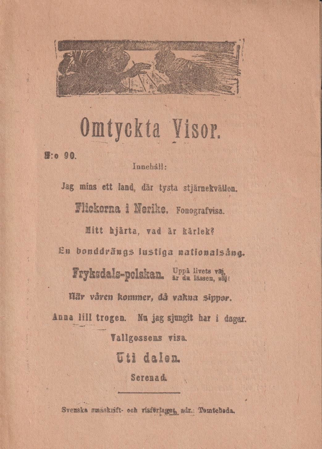 Danielson ‘Skillingtryckarna’ s. 214. [1]. Jag mins ett land, där tysta stjärnekvällen. [2]. Flickorna i Nerike. Fonografvisa. [3]. Mitt hjärta, vad är kärlek? [4]. En bonddrängs lustiga nationalsång. [5]. Fryksdals-polskan. [6]. När våren kommer, då vaknar sippar. [7]. Anna lill trogen. Nu jag sjungit har i dagar. [8]. Vallgossens visa. [9]. Uti dalen.