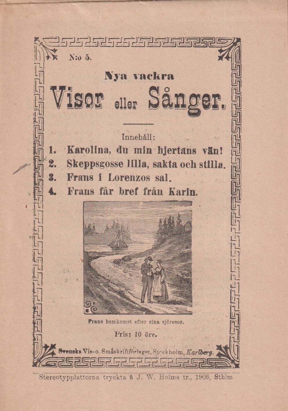 Nya vackra Visor eller Sånger. N:o 5. [Utg. av] Svenska Vis- och Småskriftförlaget.