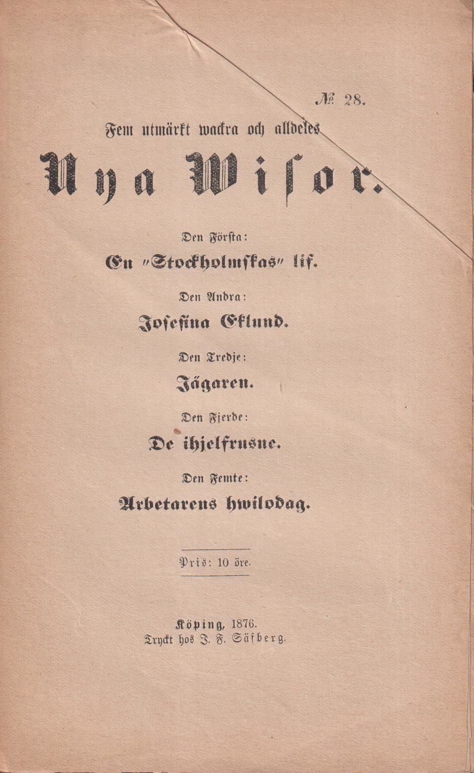 Fem utmärkt wackra och alldeles nya wisor. Den första: En ‘Stockholmskas’ lif. Den andra: Josefina Eklund. Den tredje: Jägaren. Den fjerde: De ihjelfrusne. Den femte: Arbetarens hwilodag.