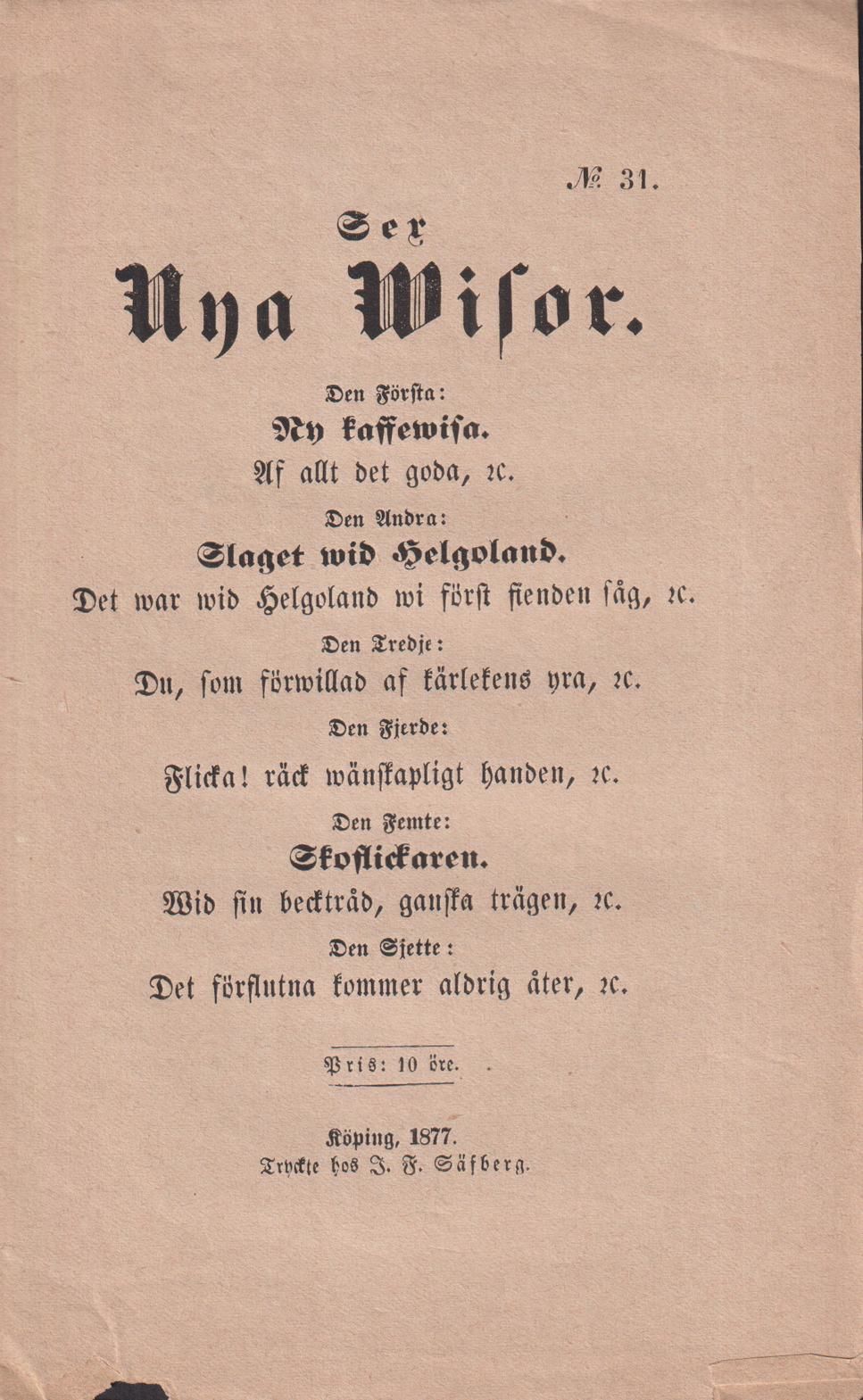 Sex nya wisor. Den första: Ny kaffewisa. Af allt det goda, &c. Den andra: Slaget wid Helgoland. Det war wid Helgoland wi först fienden såg, &c. Den tredje: Du, som förwillad af kärlekens yra, &c. Den fjerde: Flicka! räck wänskapligt handen, &c. Den femte: Skoflickaren. Wid sin becktråd, ganska trägen, &c. Den sjette: Det förflutna kommer aldrig åter, &c.