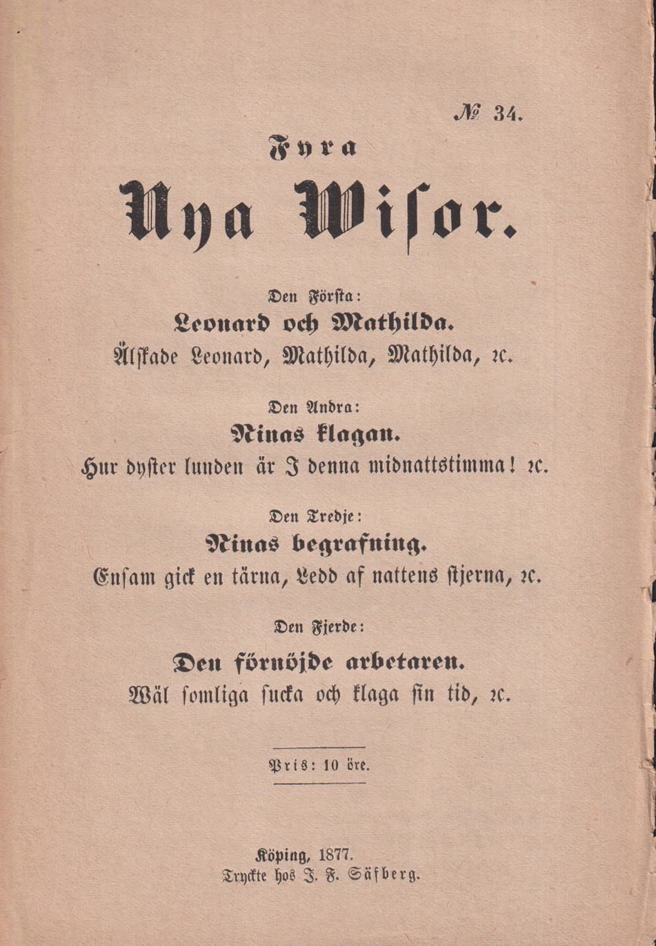 Köping, tryckt hos J.F. Säfberg, 1877. 8:o. (8) s. Vikt ouppsprättat ark. Åldersmörknat trähaltigt och sprött papper. Marginalriss och/eller mindre pappersförlust förekommer.