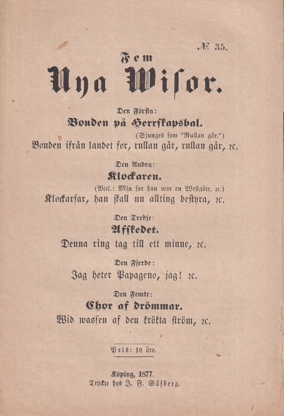 Fem nya wisor. Den första: Bonden på herrskapsbal. Bonden ifrån landets for, rullan går, rullan går, &c. Den andra: Klockaren. Klockarfar, han skall nu allting bestyra, &c. Den tredje: Afskedet. Denna ring tag till ett minne, &c. Den fjerde: Jag heter Papageno, jag ! &c. Den femte: Chor af drömmar. Wid wassen af den trötta ström, &c.