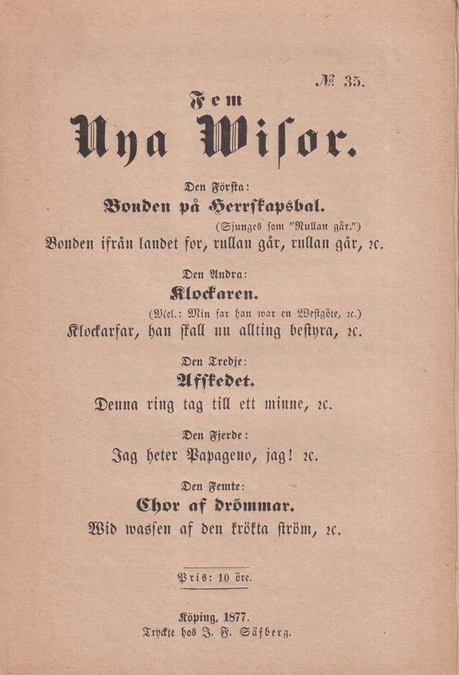Fem nya wisor. Den första: Bonden på herrskapsbal. Bonden ifrån landets for, rullan går, rullan går, &c. Den andra: Klockaren. Klockarfar, han skall nu allting bestyra, &c. Den tredje: Afskedet. Denna ring tag till ett minne, &c. Den fjerde: Jag heter Papageno, jag ! &c. Den femte: Chor af drömmar. Wid wassen af den trötta ström, &c.