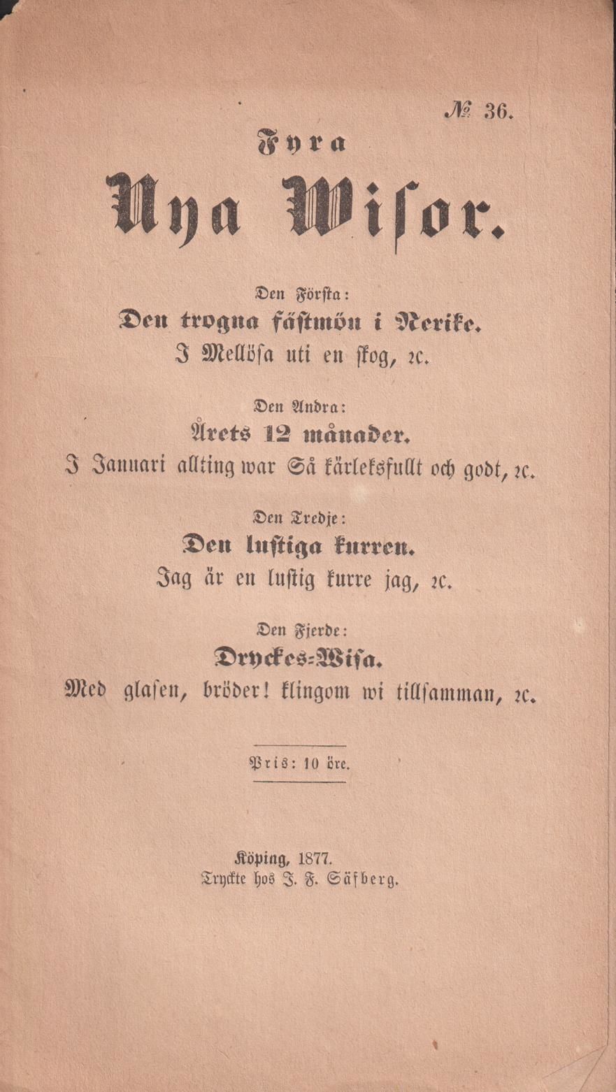 Fyra nya wisor. Den första: Den trogna fästmön i Nerike. I Mellösa uti en skog, &c. Den andra: Årets 12 månader. I januari allting war så kärleksfullt och godt, &c. Den tredje: Den lustiga kurren. Jag är en lustig kurre jag, &c. Den fjerde: Dryckes-Wisa. Med glasen, bröder! Klingom wi tillsamman, &c.